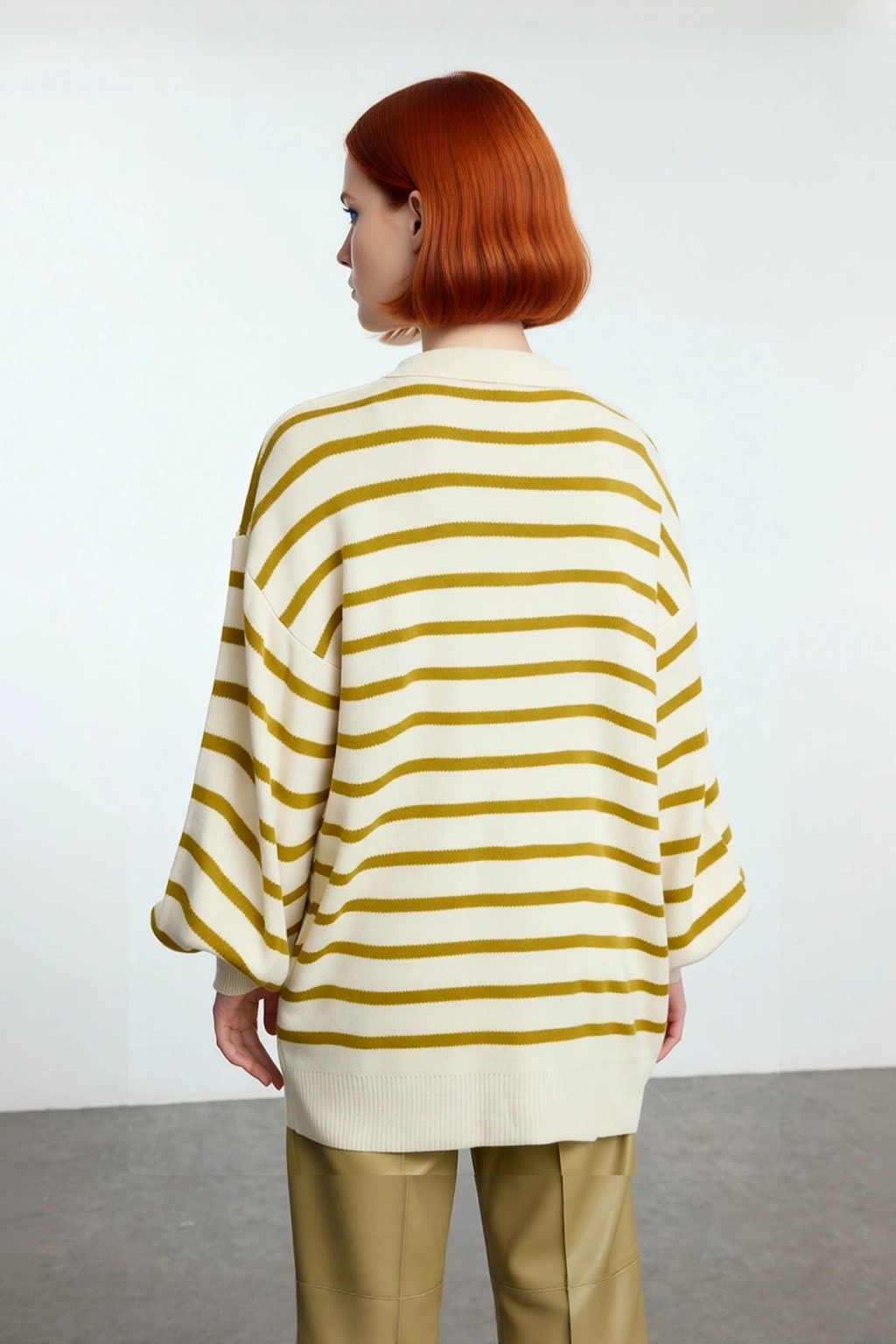 Bu modern ve konforlu kadın kazak, relaxed kalıbı ile gün boyu süren rahatlık sunarken, şık duruşuyla dikkatleri üzerinize çeker. Yüksek kaliteli %100 akrilik materyalden üretilen bu triko kazak, soğuk kış günlerinde dahi sizi sıcacık tutar ve yumuşacık dokusuyla cildinize nazik bir his verir. Lacivert ve beyazın zamansız uyumuyla oluşturulmuş çizgili deseni, klasik denizci temasını modern bir yorumla buluşturur. Zarif polo yaka detayı ve altın rengi düğmeleriyle tamamlanan yarım patlı tasarımı, kazaka sofistike bir hava katarak günlük stilinize kolayca adapte olmasını sağlar. Gardırobunuzun vazgeçilmezi olmaya aday bu parça, hem rahatlığı hem de stil sahibi görünümü önemseyen kadınlar için idealdir.