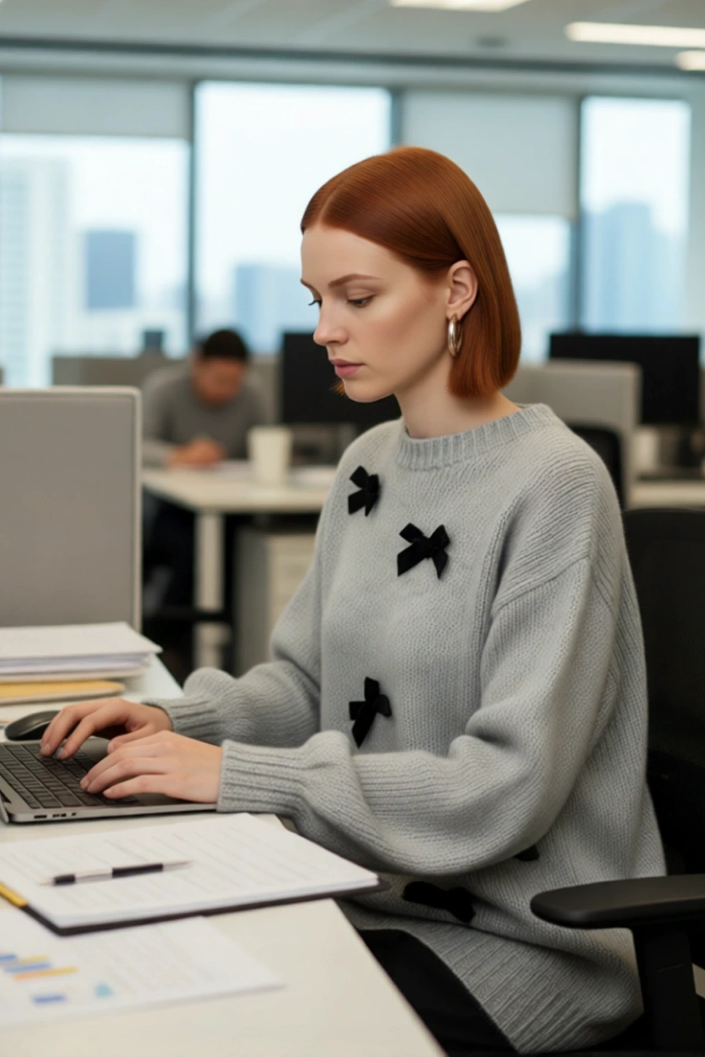 Bu kadın kazak, relaxed kesimi sayesinde gün boyu süren rahatlığı ve modern bir şıklığı bir arada sunar. Yumuşak tuşeli triko kumaşı, %75 akrilik ve %25 polyester materyal bileşimiyle soğuk havalarda sizi sıcacık tutarken, cildinize dost bir dokunuş hissi verir. Ürüne zarif bir hava katan fiyonk detayları, düz gri zeminde dikkat çekici bir estetik yaratır. Feminine bir duruş sergileyen bu parça, Ramadan koleksiyonunun basic siluetiyle her kadının gardırobuna zarafet katmaya hazır.