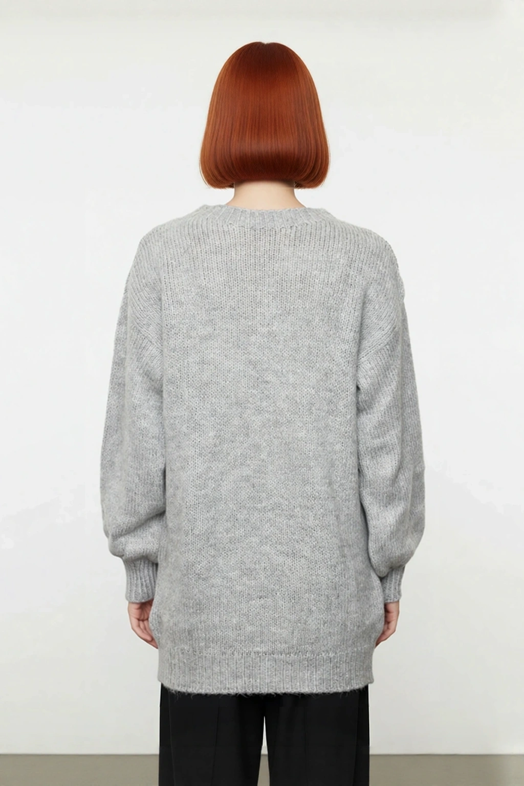 Ürün Özellikleri: Relaxed kalıp, %75 akrilik %25 polyester materyal, düz desen, bisiklet yaka, düşük kol, triko kumaş, gri renk, fiyonklu tasarım.