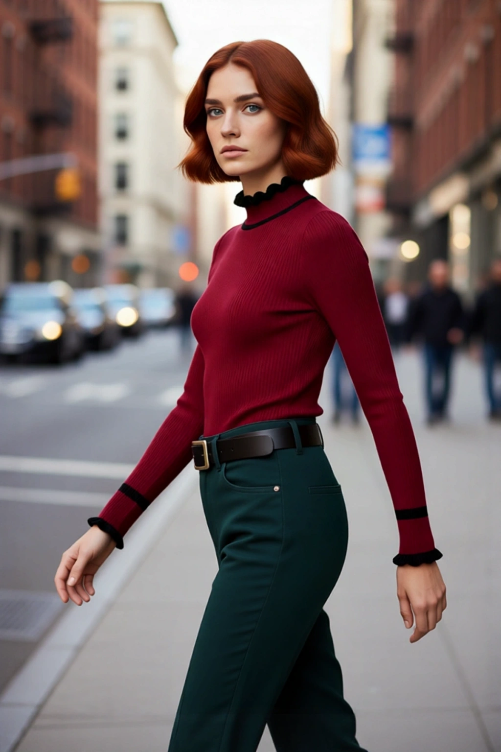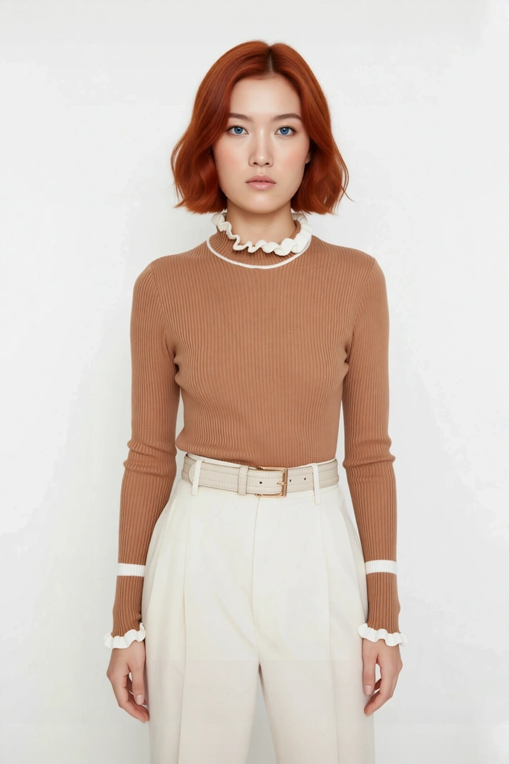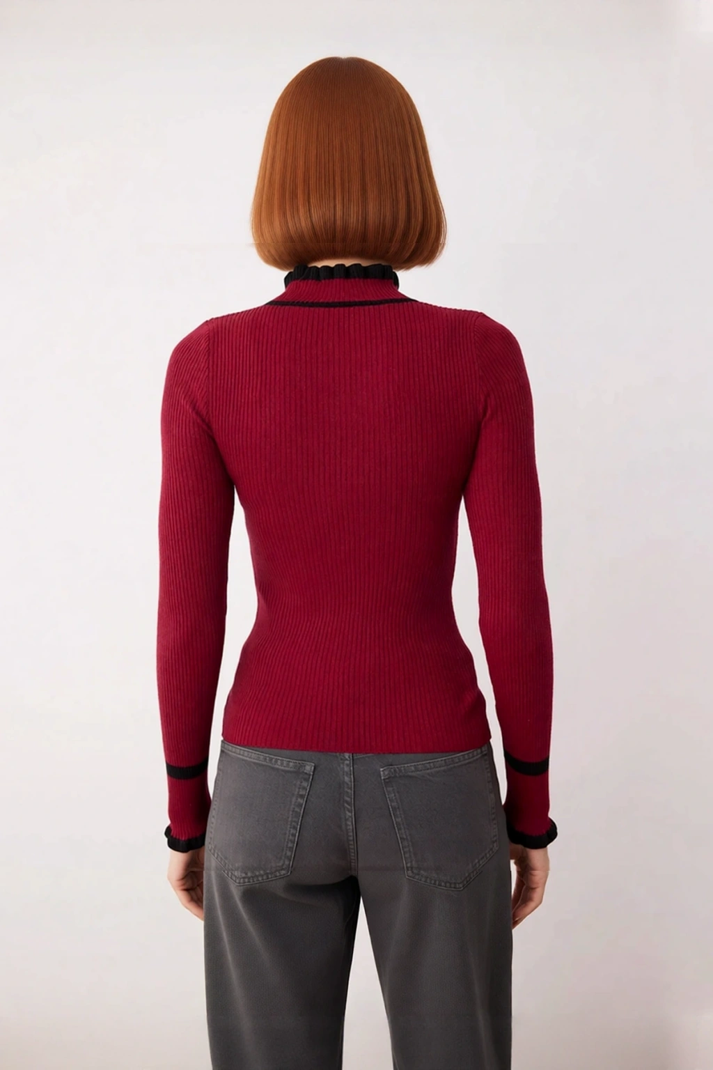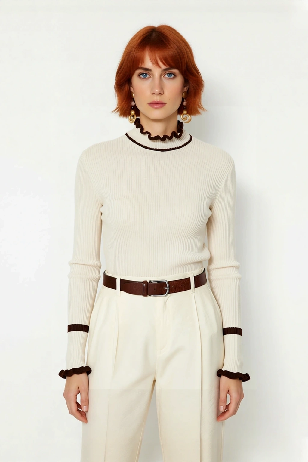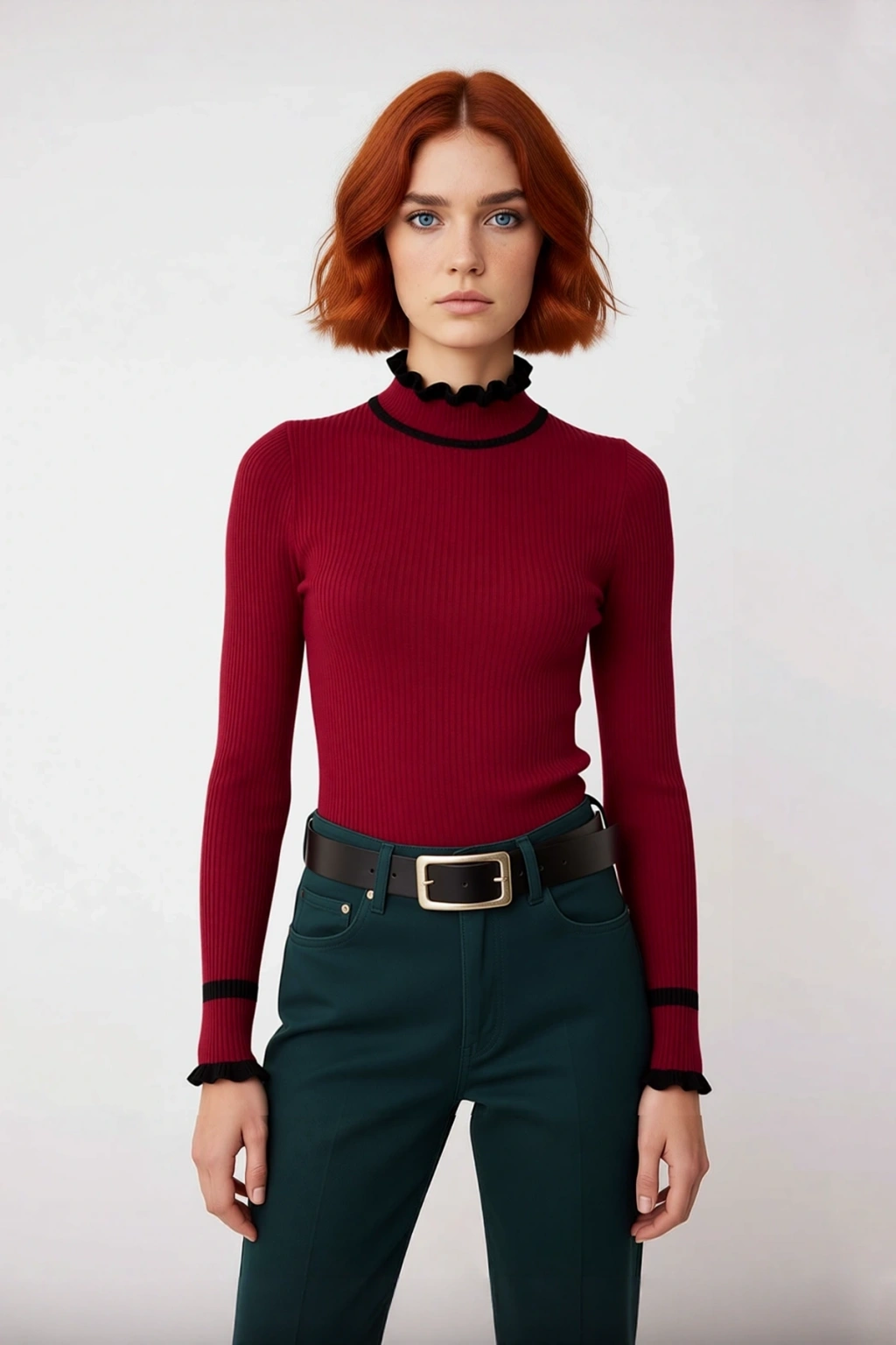 Dik yaka tipi, boynu nazikçe sararak soğuktan korurken, yaka ve kol manşetlerindeki fırfırlı renk bloklu detaylar ürüne feminen ve şık bir dokunuş ekler. Standart kol tipi ve uzun kol boyu, hareket özgürlüğü sağlarken rahat bir kullanım deneyimi sunar. Orta kalınlıkta triko kumaş dokusu, nefes alabilir özelliğiyle gün boyu rahatlık vaat ederken, dayanıklı yapısı sayesinde uzun süreli kullanıma olanak tanır. Kemer veya kuşak gerektirmeyen basic tasarımı, pratik bir giyim alternatifi sunar. Makinede yıkanabilir özelliği ile bakımı oldukça kolaydır, bu da yoğun yaşam temposunda büyük bir avantajdır.