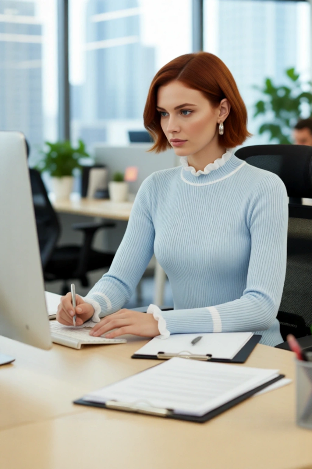 Bu kadın triko kazak, fitted kalıbı ile vücuda zarifçe oturarak modern bir siluet sunar. Yüksek kaliteli %100 akrilik materyali sayesinde kış aylarının soğuk günlerinde üstün sıcaklık ve konfor sağlarken, aynı zamanda cilde yumuşak bir dokunuş hissi verir. Mavi rengi, renk bloklu tasarımıyla (yaka ve kol detaylarındaki beyaz şeritler) dinamik bir hava katarak gardırobunuza canlılık getirir. Fitilli dokuma tipi, kazaka kendine özgü bir doku ve estetik derinlik kazandırır, sade ve basic silueti ise her tarza kolayca uyum sağlar. Cepsiz tasarımı temiz ve minimalist bir görünüm sunar.
