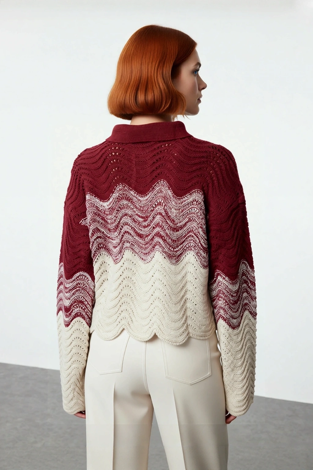 Bu özel tasarım Kadın Renk Bloklu Polo Yaka Uzun Kollu Triko Kazak, kış sezonunun soğuk günlerinde hem sıcak kalmak hem de stil sahibi görünmek isteyen kadınlar için vazgeçilmez bir parçadır. Göz alıcı bordo ve krem tonlarındaki dalgalı renk bloklu deseniyle dikkat çeken bu kazak, gardırobunuza enerji katacak. %100 akrilik materyali sayesinde yumuşak bir dokunuş hissi verirken, regüler kalıbı ve crop kesimi modern bir siluet sunar. Basic yapısıyla her tarza kolayca uyum sağlayabilen bu triko, mücevher düğme detaylarıyla da fark yaratır.