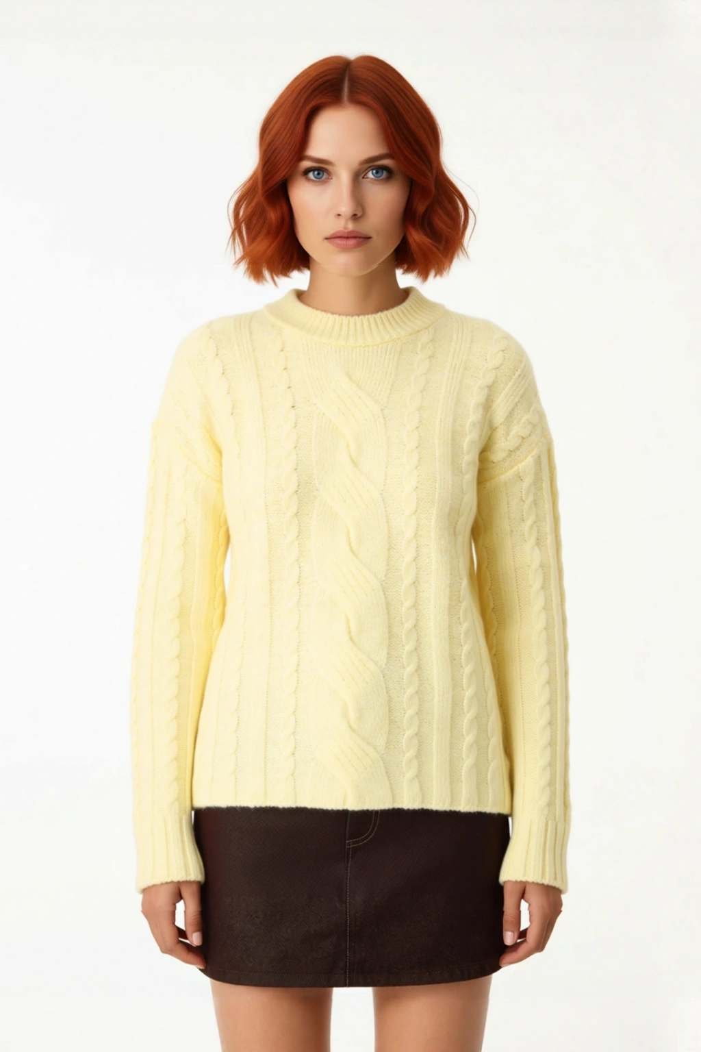 Ürün Özellikleri: Regular kalıp, Akrilik Polyester karışımı materyal, saç örgü desen, bisiklet yaka, düşük kol, triko kumaş, ekru renk.