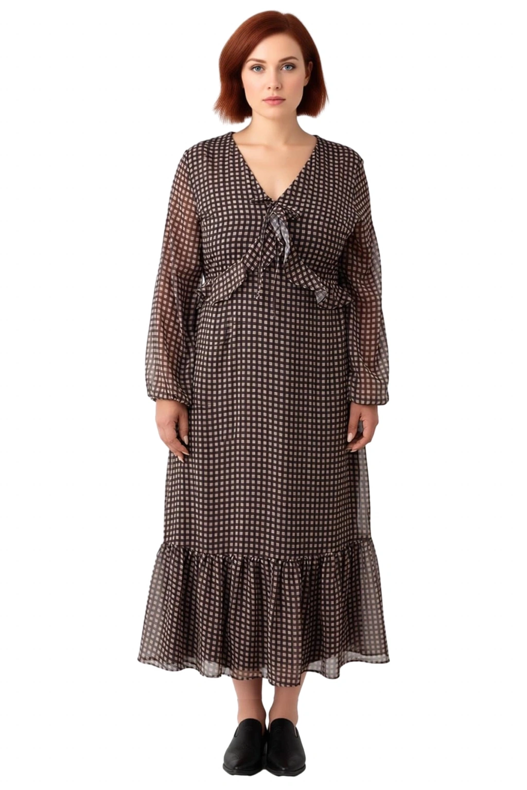 Elbisenin V yaka kesimi, modern ve çekici bir duruş sergilerken, balon kol tipi uzun kollarıyla hareketli bir stil yaratır. Şifon dokuma kumaşın ince yapısı, hava akışını destekleyerek ferah bir his verirken, dayanıklılığı sayesinde uzun süreli kullanım imkanı sunar. Şal desenin karmaşık detayları, elbiseye sanatsal bir derinlik katarken, makinede yıkanabilirlik özelliği bakım kolaylığı sağlar. Bu tasarım, hem gündüz hem de gece şıklığı için mükemmeldir.