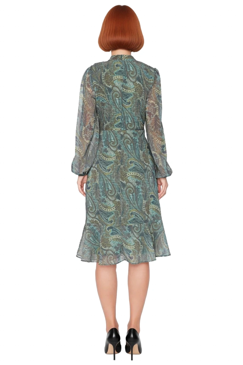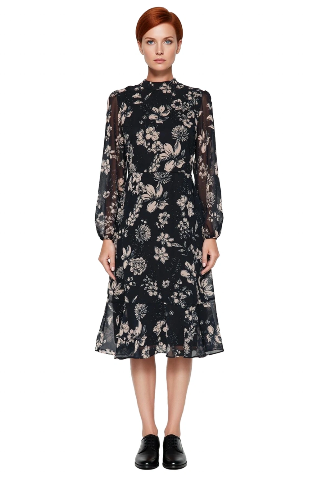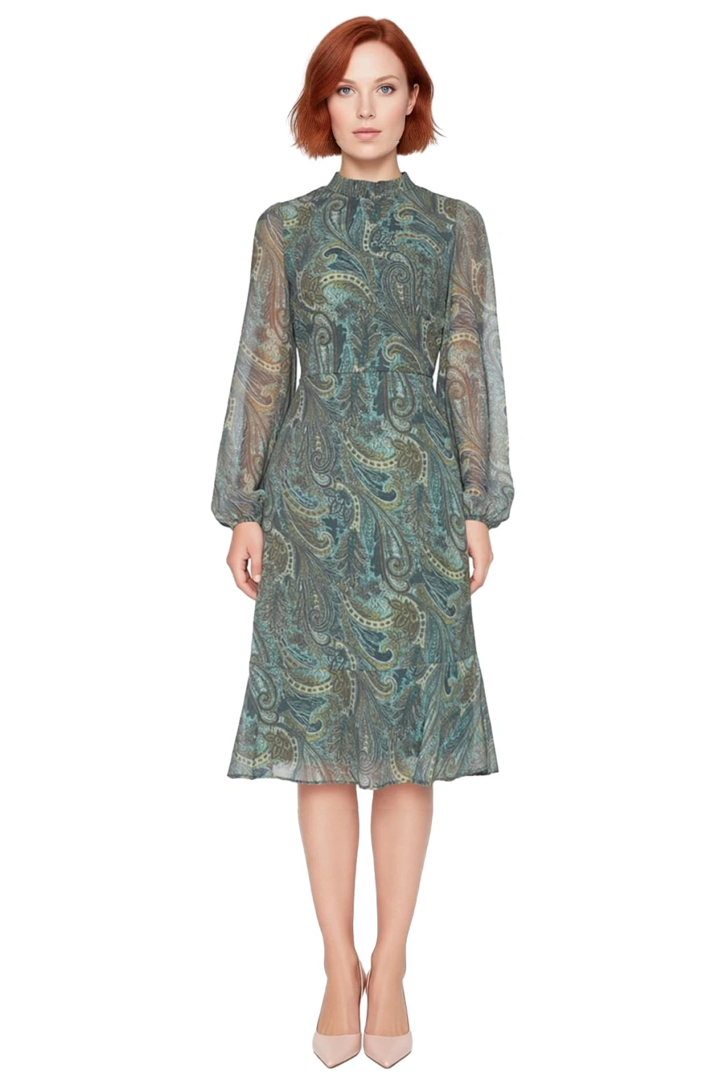 Dik yaka tasarımı, elbiseye modern ve zarif bir dokunuş katarken, uzun balon kolları trendleri yakalayan sofistike bir görünüm sunar. Bu özel kol tipi, hareket özgürlüğünü kısıtlamadan hacimli ve şık bir duruş sergiler. Şifon dokuma tipi, nefes alabilen yapısıyla özellikle ilkbahar ve yaz sıcaklarında serin ve rahat kalmanızı sağlar. Cepsiz ve kemersiz tasarımı, elbisenin akışkan siluetini bozmadan minimalist bir şıklık sunar. T10 yıkama talimatı sayesinde bakımı oldukça kolaydır ve dayanıklı materyali sayesinde uzun ömürlü bir kullanım vaat eder.