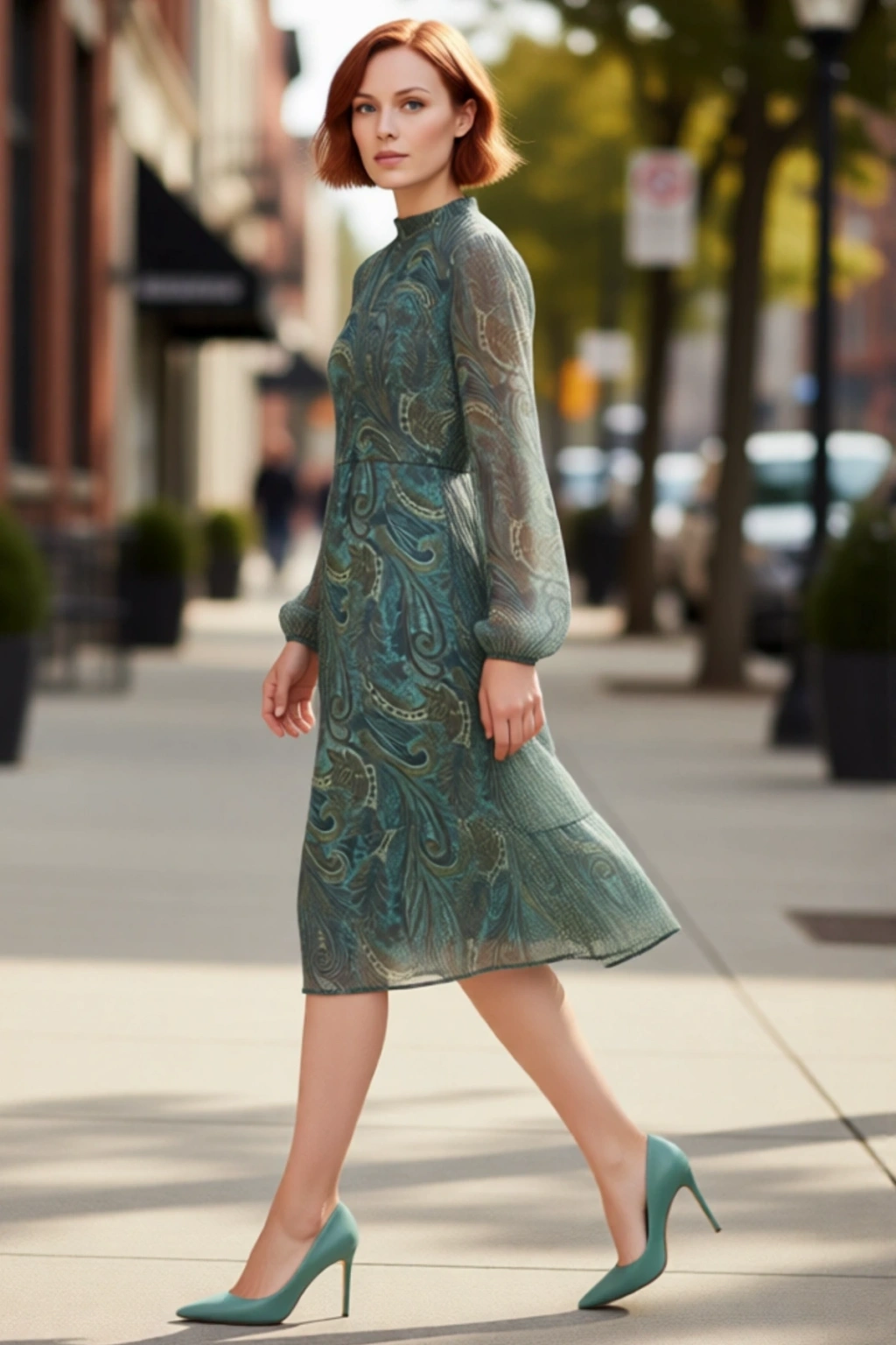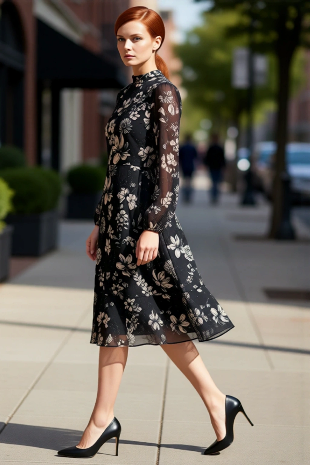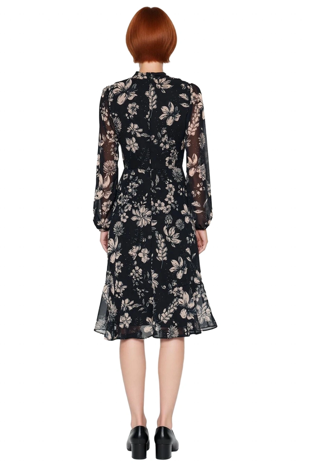 Dik yaka tasarımı, elbiseye modern ve zarif bir dokunuş katarken, uzun balon kolları trendleri yakalayan sofistike bir görünüm sunar. Bu özel kol tipi, hareket özgürlüğünü kısıtlamadan hacimli ve şık bir duruş sergiler. Şifon dokuma tipi, nefes alabilen yapısıyla özellikle ilkbahar ve yaz sıcaklarında serin ve rahat kalmanızı sağlar. Cepsiz ve kemersiz tasarımı, elbisenin akışkan siluetini bozmadan minimalist bir şıklık sunar. T10 yıkama talimatı sayesinde bakımı oldukça kolaydır ve dayanıklı materyali sayesinde uzun ömürlü bir kullanım vaat eder.