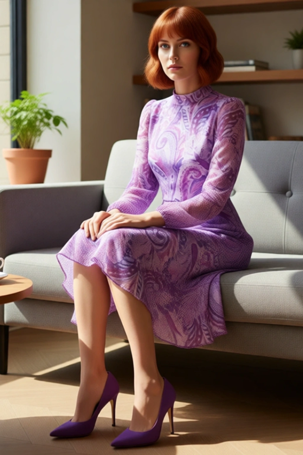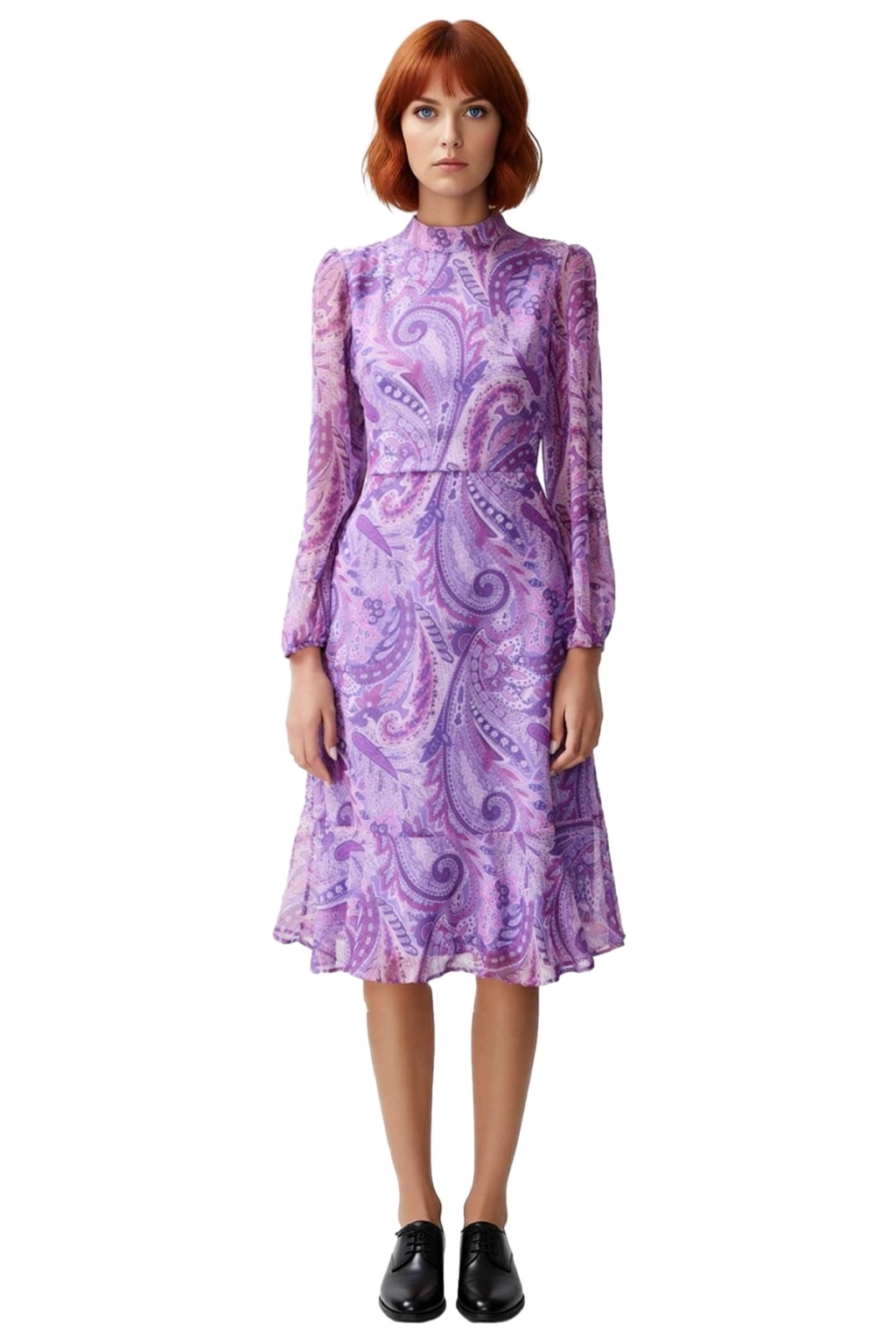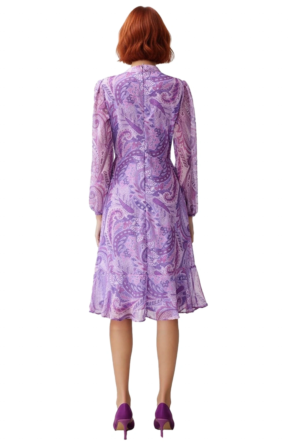 Ürün Özellikleri: A-line kalıp, 100% polyester materyal, şal desen, dik yaka, uzun balon kol, şifon kumaş, mor renk, fırfırlı tasarım, astarlı.