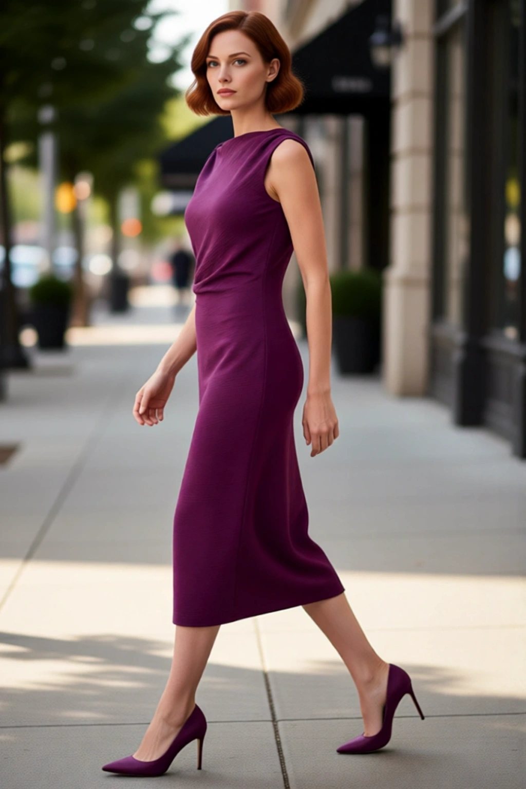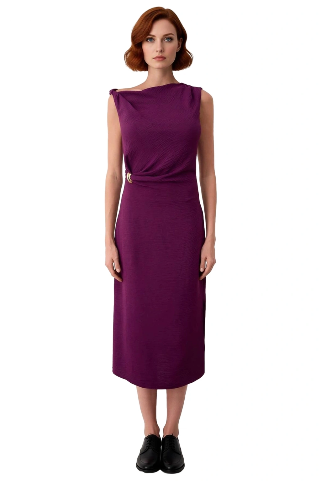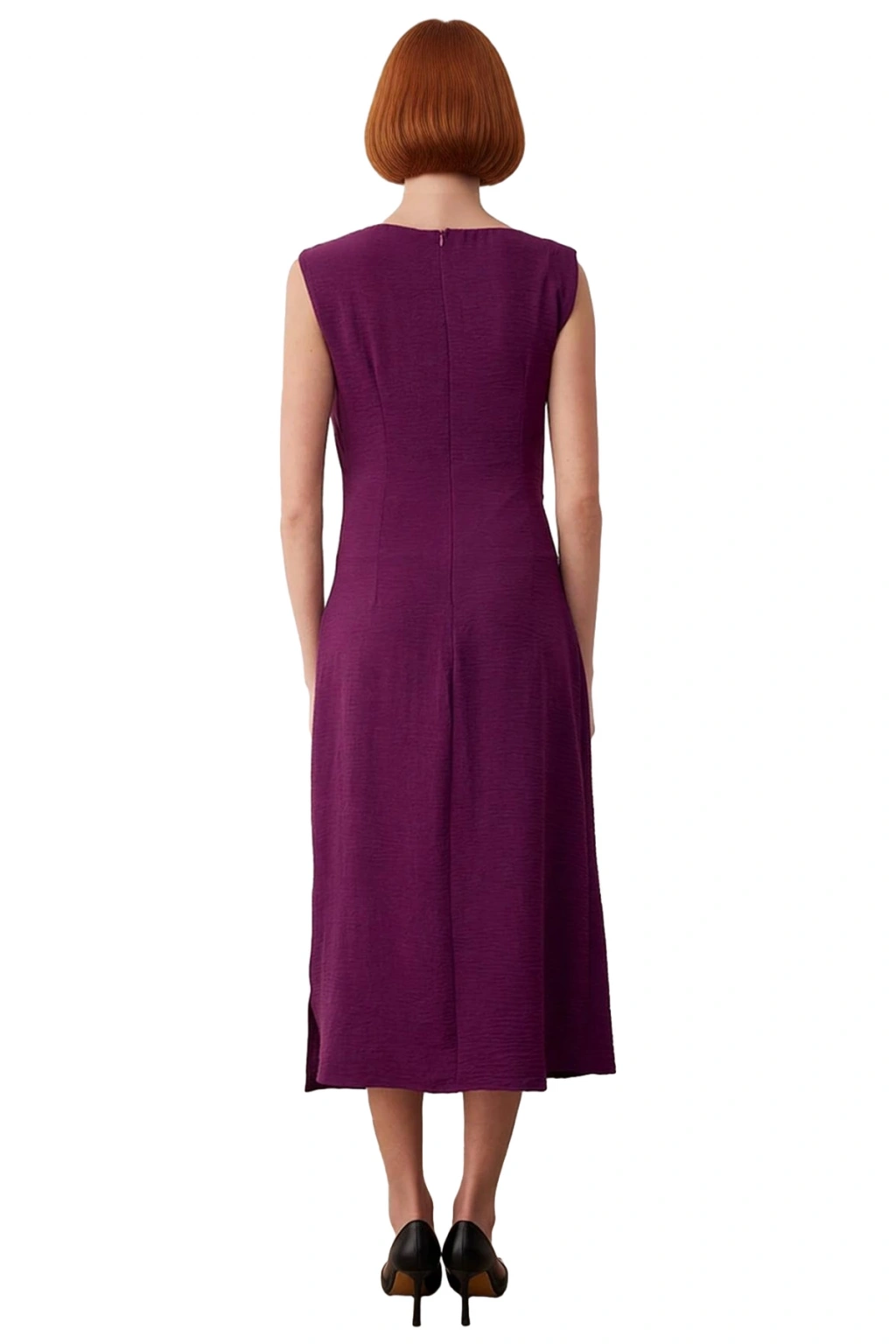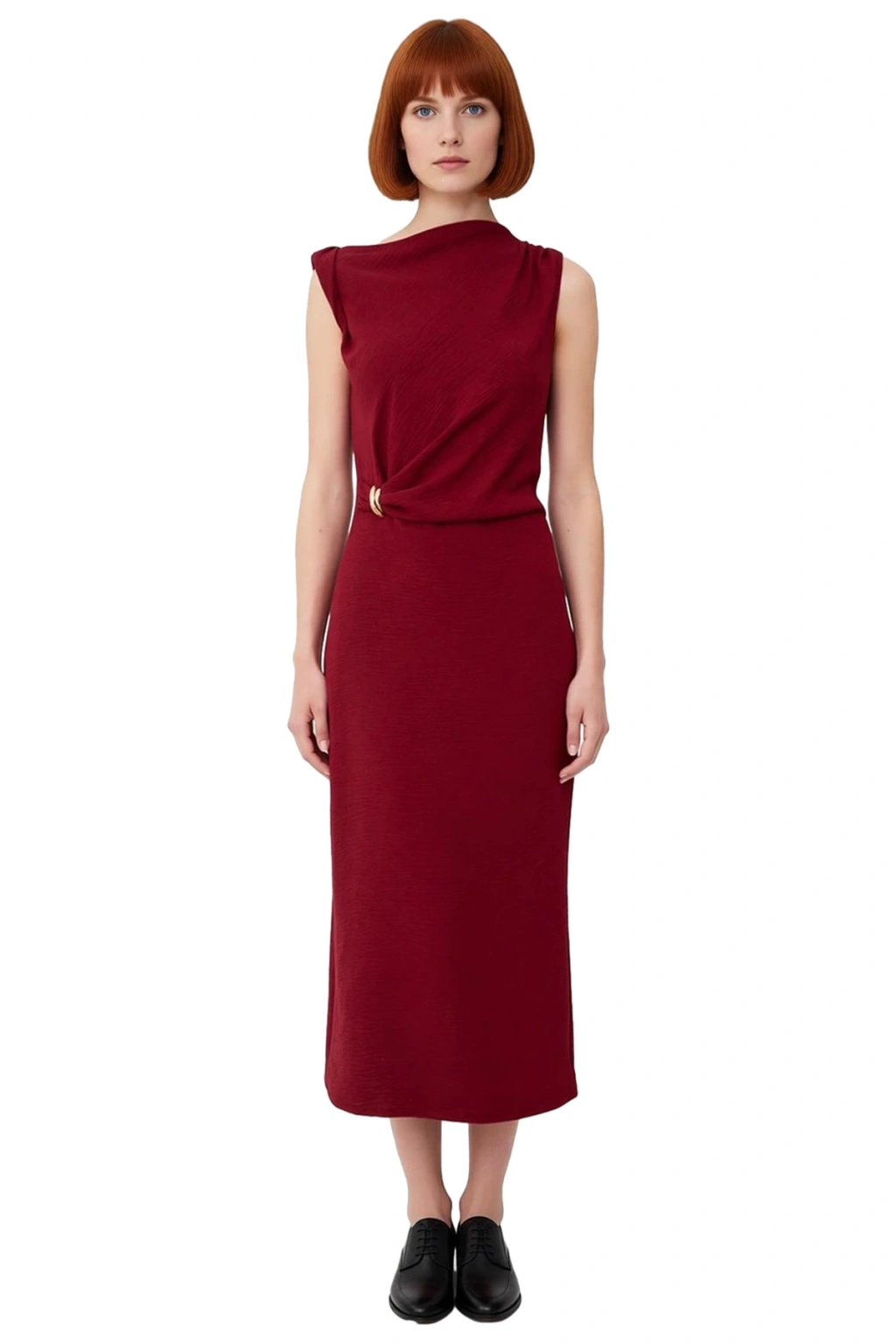 Ürün Özellikleri: Shift kalıp, %100 polyester materyal, düz desen, kayık yaka, kolsuz, dokuma kumaş, bordo renk, astarlı tasarım.