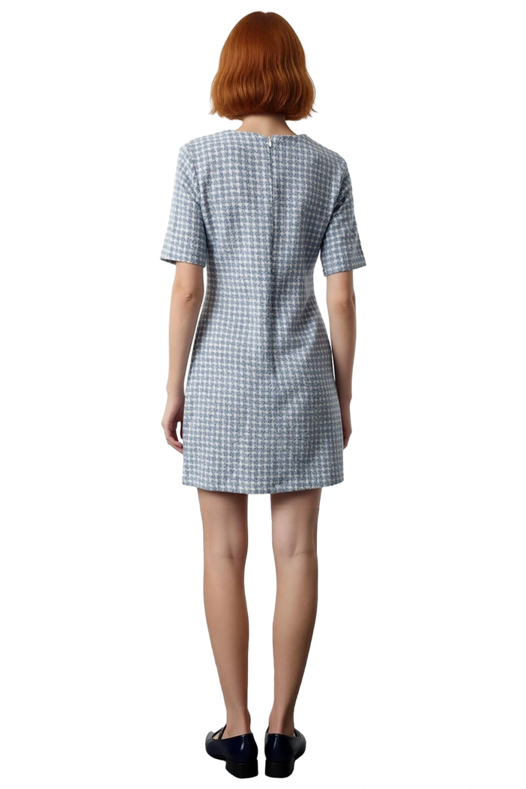 Bu zarif kadın elbisesi, zamansız şıklığı modern bir dokunuşla bir araya getiriyor. Rahat shift kalıbı sayesinde gün boyu konfor sunarken, %100 pamuk materyali cildinize nefes aldıran doğal bir his verir. Klasik kazayağı deseni ve tüvit dokuma kumaşı ile dikkat çeken bu krem renkli elbise, sofistike tarzınızı yansıtır. Kısa kol ve bisiklet yaka tasarımı, ilkbahar ve sonbahar mevsimlerinde gardırobunuzun vazgeçilmezi olmaya adaydır. Üzerindeki dekoratif düğme detaylı cepler, elbiseye özgün ve şık bir hava katıyor.
