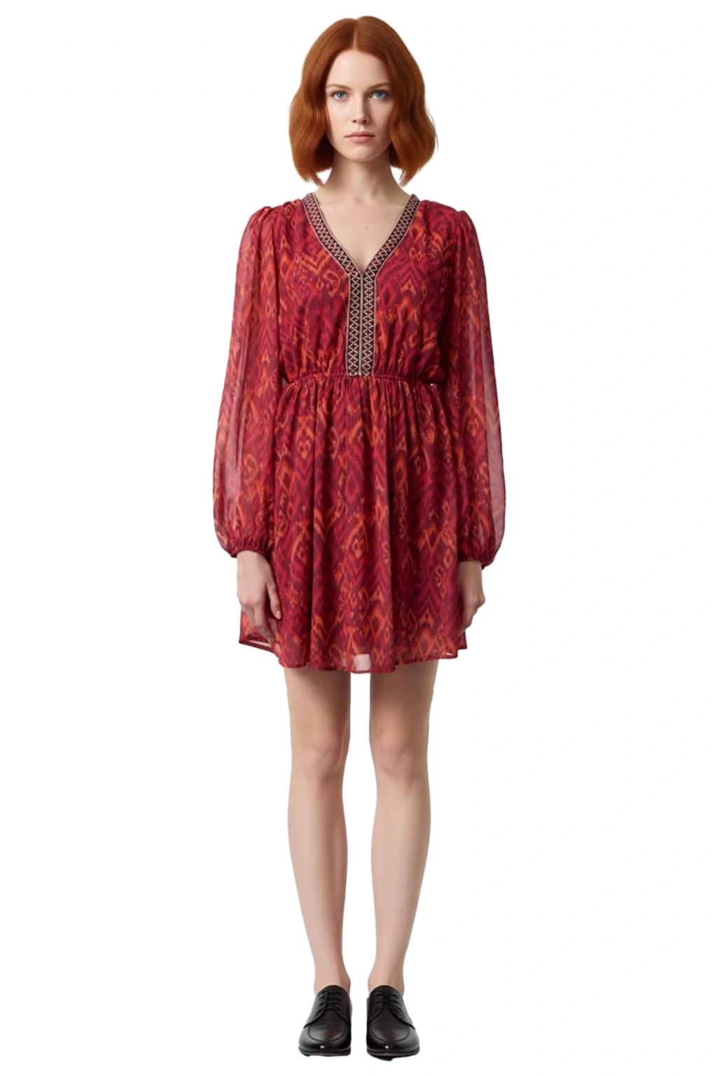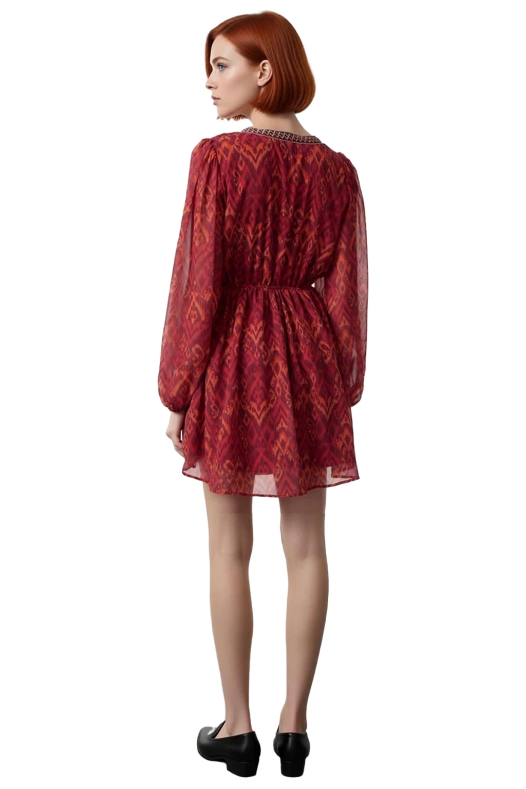 Kadınlar için tasarlanmış bu şık şifon dokuma mini elbise, skater kalıbıyla belden oturan ve etek kısmında hareketli bir görünüm sunar. %100 polyester materyali sayesinde hafif, dökümlü ve nefes alabilir bir yapıya sahiptir. Bordo rengi ve dikkat çekici çiçekli deseniyle her ortamda fark yaratmanızı sağlar. Astarlı oluşu sayesinde iç göstermezken, V yaka tasarımı modern ve çekici bir dokunuş katar. Uzun standart kolları ise elbiseye zarif bir hava verirken, ilkbahar ve yaz akşamlarında veya sonbahar başlangıcında ideal bir tercihtir.