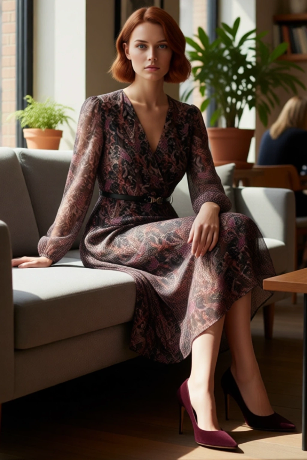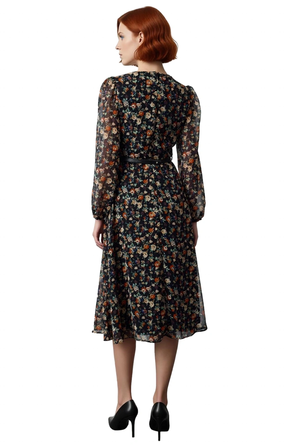 Ürün Özellikleri: Skater kalıp, polyester materyal, soyut desen, kruvaze yaka, uzun balon kol, dokuma şifon kumaş, kahverengi renk, kemerli tasarım.