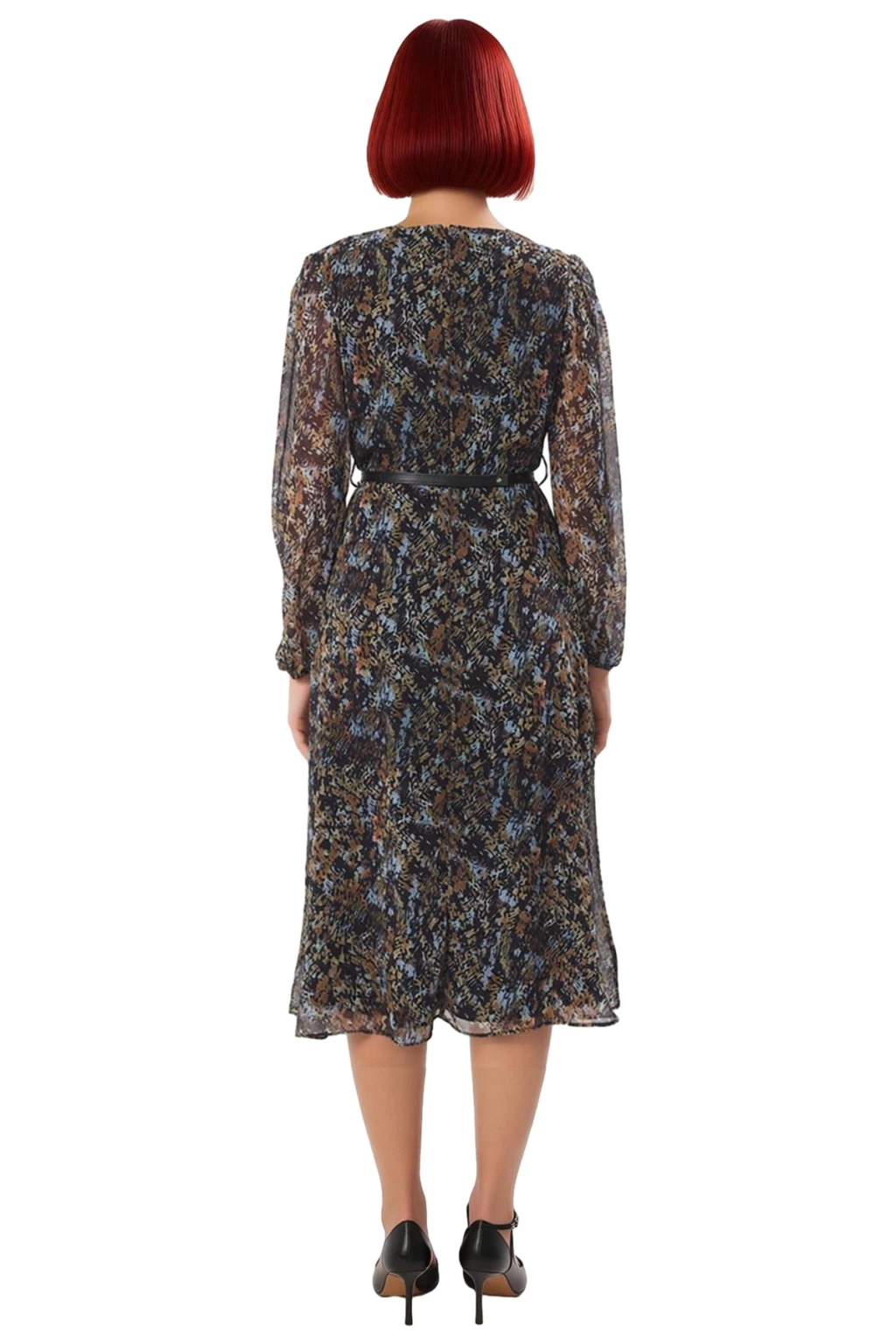 Ürün Özellikleri: Skater kalıp, polyester materyal, soyut desen, kruvaze yaka, uzun balon kol, dokuma şifon kumaş, kahverengi renk, kemerli tasarım.