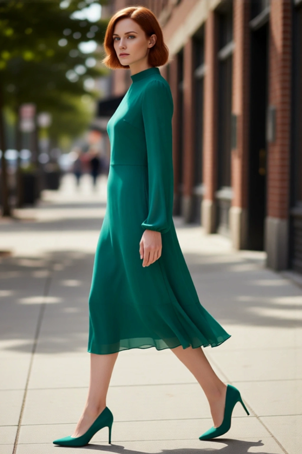 Midi boyu ile gündüz ofis ortamından gece şık davetlere kadar geniş bir kullanım alanı sunan bu elbise, özellikle ilkbahar ve sonbahar aylarında gardırobunuzun vazgeçilmezi olacak. Topuklu ayakkabılar, küçük bir çanta ve zarif aksesuarlarla tamamlayarak her ortamda şıklığınızı ön plana çıkarabilirsiniz. Feminine ruhunu yansıtan bu tasarım, her an kendinizi özel ve çekici hissetmenizi sağlayacak bir seçenek sunar.