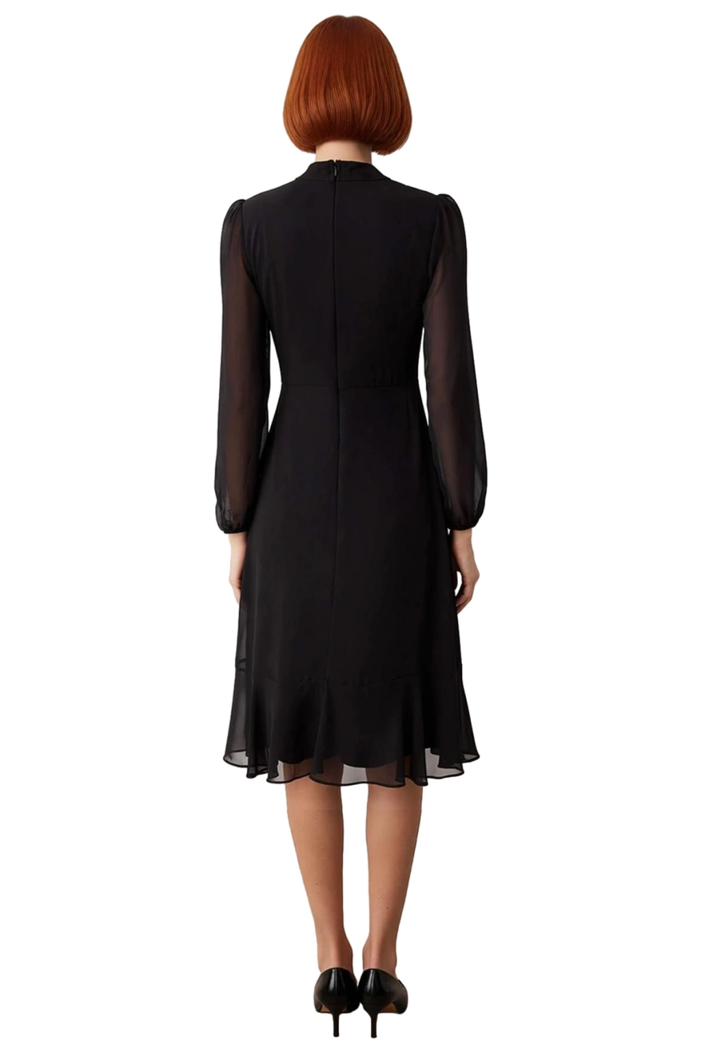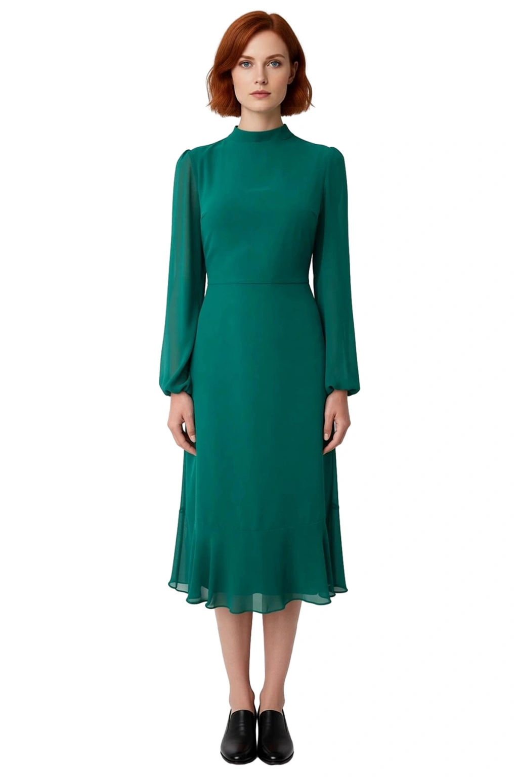 Elbisenin dik yaka tasarımı, klasik zarafeti modern bir dokunuşla birleştirir ve boynu nazikçe sararak şık bir görünüm sunar. Uzun balon kol detayı, romantik ve trend bir görünüm sunarken, bilek kısımlarındaki lastikli bitişi sayesinde gün boyu hareket özgürlüğünüzü kısıtlamaz. Tamamen astarlı yapısı sayesinde iç göstermeyen ve güvenle giyilebilir bir konfor sunar. Etek ucundaki fırfırlı detay, elbiseye dinamik bir hareketlilik katarak feminen ve enerjik bir hava verir. Cepsiz tasarımı ise ürünün sade ve akıcı çizgisini korurken, genel estetiği tamamlar. Makinede yıkanabilir özelliği ile bakımı oldukça kolaydır, bu da uzun ömürlü kullanım için idealdir.