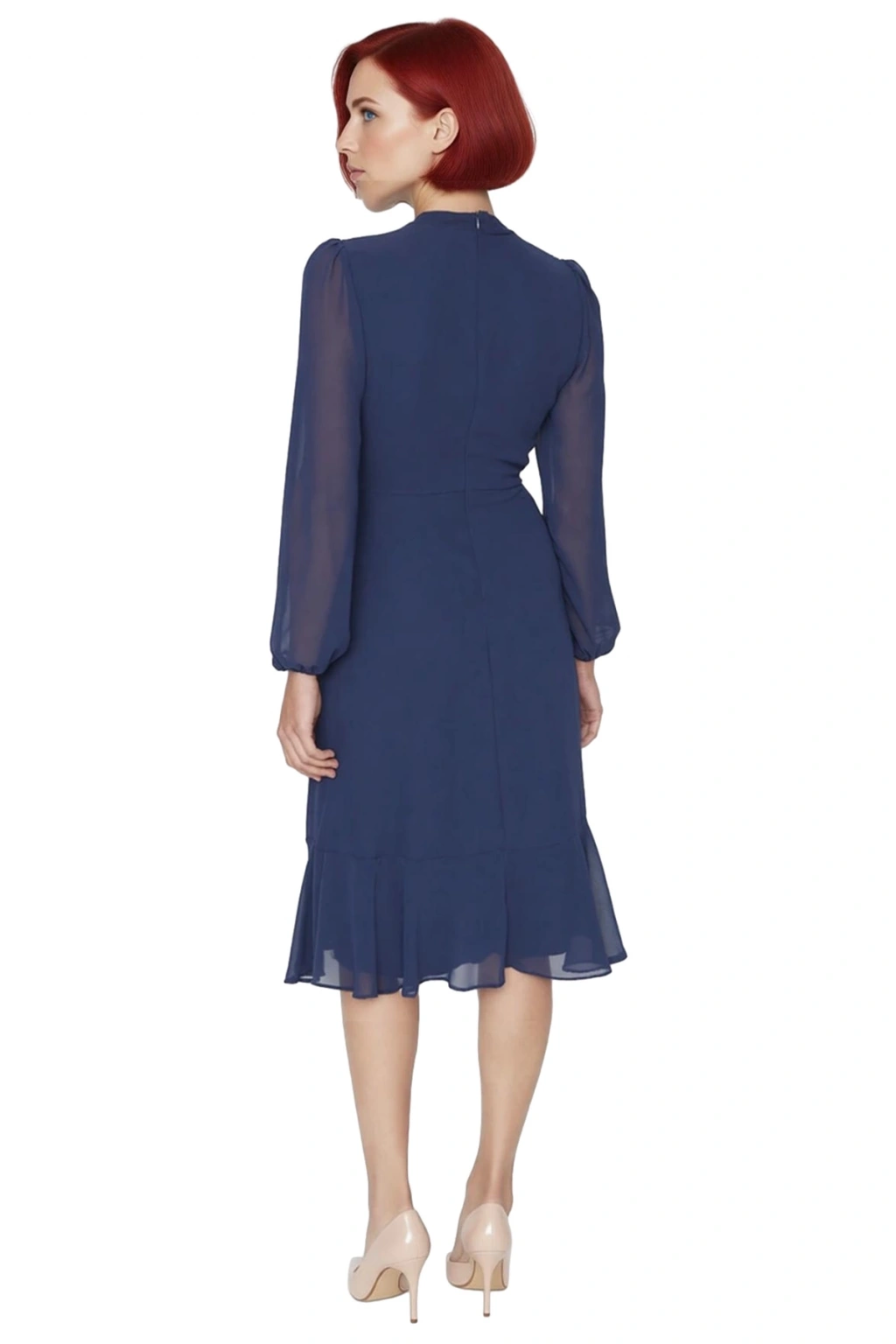 Ürün Özellikleri: A kesim kalıp, %100 polyester materyal, düz desen, dik yaka, uzun balon kol, şifon dokuma kumaş, lacivert renk, astarlı tasarım.