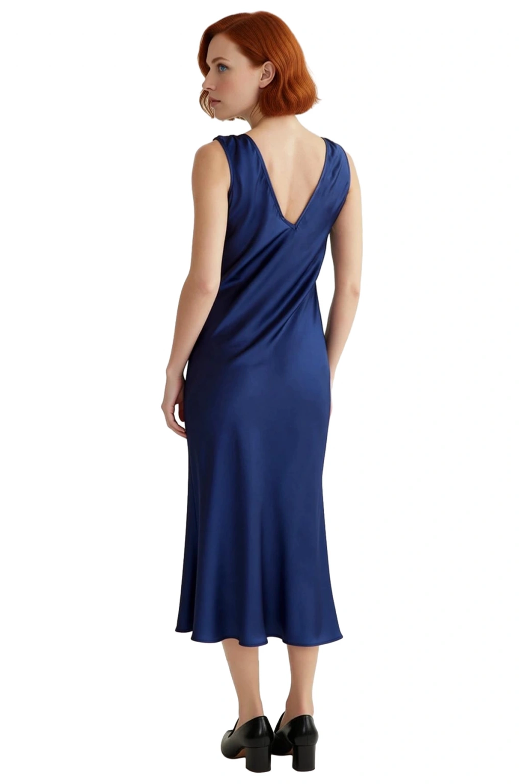 Ürün Özellikleri: Shift kalıp, polyester materyal, düz desen, asimetrik yaka, kolsuz kol, dokuma saten kumaş, lacivert renk, maxi boy, aksesuar detaylı, astarsız.