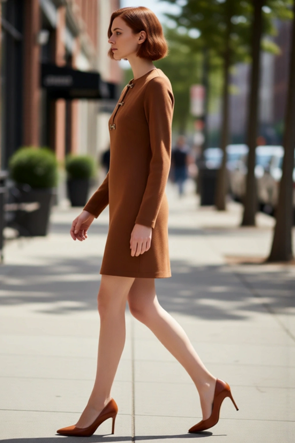 Ürün Özellikleri: Shift kalıp, polyester karışımlı materyal, düz desen, bisiklet yaka, standart kol, dokuma süet görünümlü kumaş, kahverengi renk, cepsiz tasarım, mini boy, kemersiz.