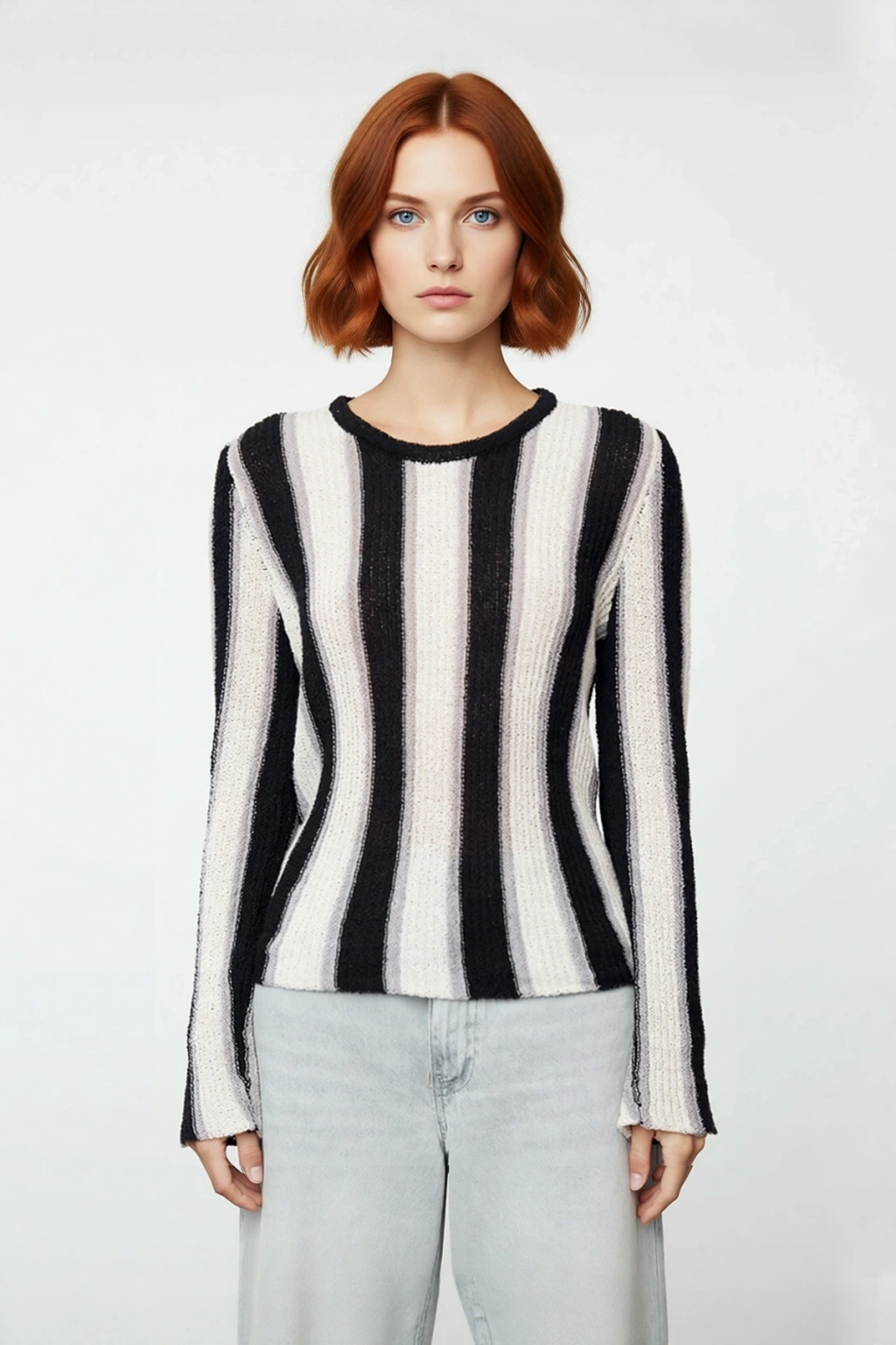 Bu Kadın Şık Bisiklet Yaka Renk Bloklu İnce Triko Kazak, zarafeti ve konforu bir araya getirerek günlük stilinize sofistike bir dokunuş katıyor. Regular kalıbı, vücuda nazikçe oturarak hem rahatlık hem de şık bir duruş sağlar. %68 pamuk ve %32 polyester materyal bileşimi, yumuşak dokusuyla cildinize dost olurken, hafif yapısıyla gün boyu rahatlık sunar. Siyah, gri ve beyaz tonlarındaki dikkat çekici renk bloklu deseni, her ortamda fark yaratmanızı sağlar. İlkbahar ve sonbahar mevsimlerinin değişken havaları için mükemmel bir seçimdir. Baskısız tasarımıyla modern ve minimalist bir siluet sunar.