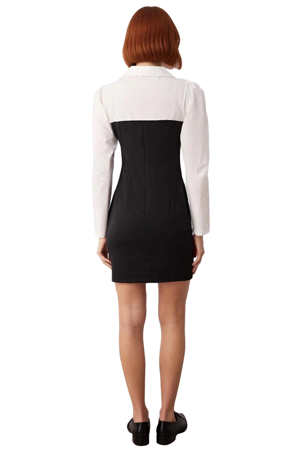 Ürün Özellikleri: Bodycon kalıp, dokuma materyal, renk bloklu desen, gömlek yaka, uzun balon kol, dokuma kumaş, siyah renk.