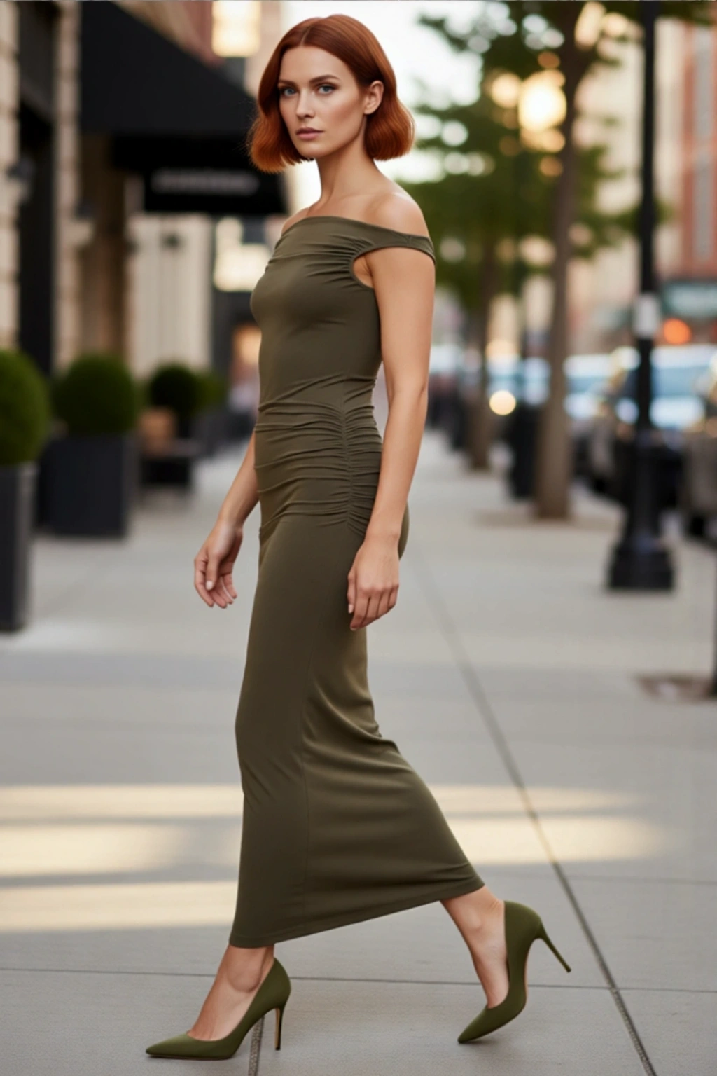 Özel kokteyl davetleri ve şık etkinlikler için tasarlanan bu kadın haki bodycon maxi elbise, vücuda tam oturan kalıbıyla feminen hatları ön plana çıkarır. Esnek ve dayanıklı polyester karışımlı materyali, gün boyu rahat bir giyim deneyimi sunarken, düz deseni ve derin haki rengi zamansız bir zarafet sağlar. Büzgü ve drape detayları, elbiseye hareketli ve sofistike bir dokunuş ekleyerek modern stilinizi tamamlar. Fashion forward bir duruş sergileyen bu parça, gardırobunuzun en çarpıcı parçalarından biri olmaya adaydır.