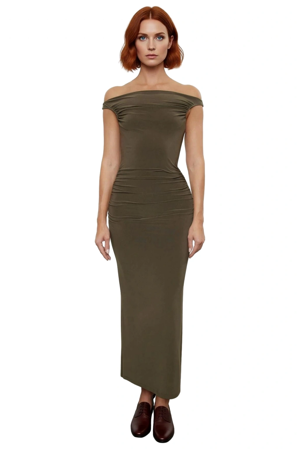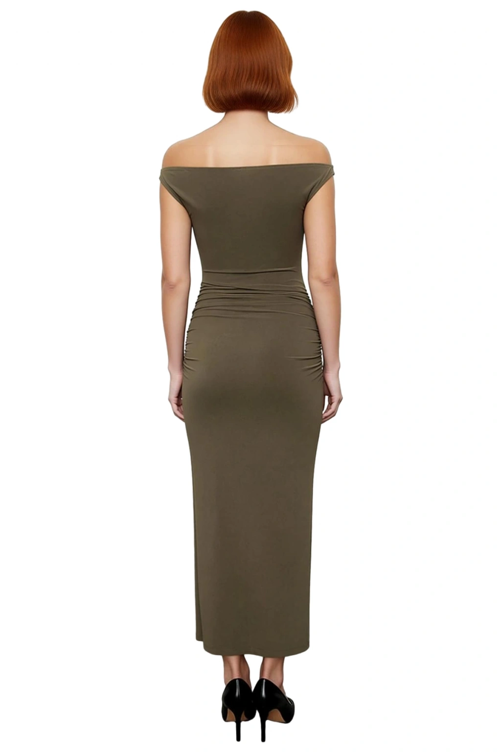 Ürün Özellikleri: Bodycon kalıp, polyester karışımlı materyal, düz desen, carmen yaka, kolsuz, örme kumaş, haki renk.