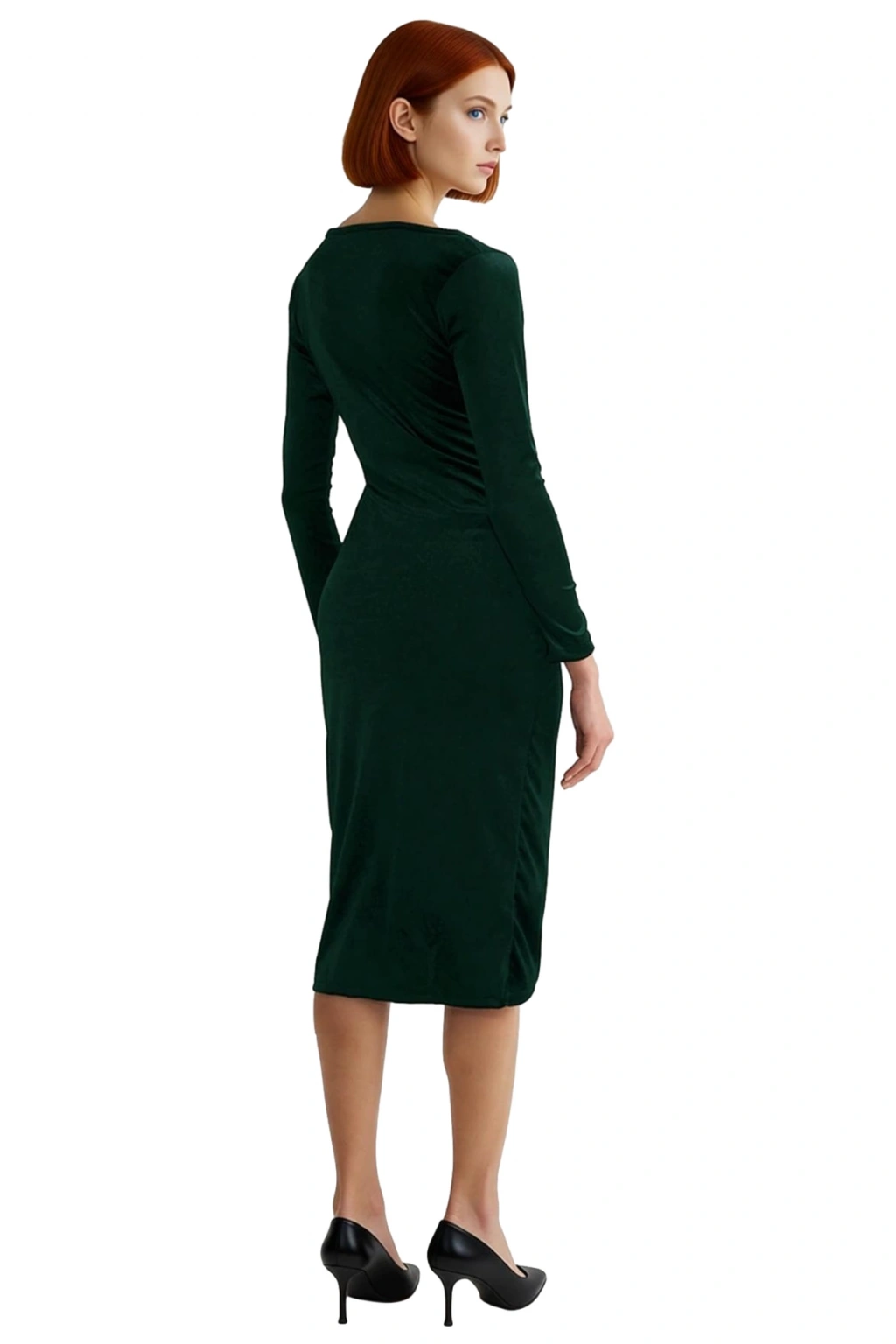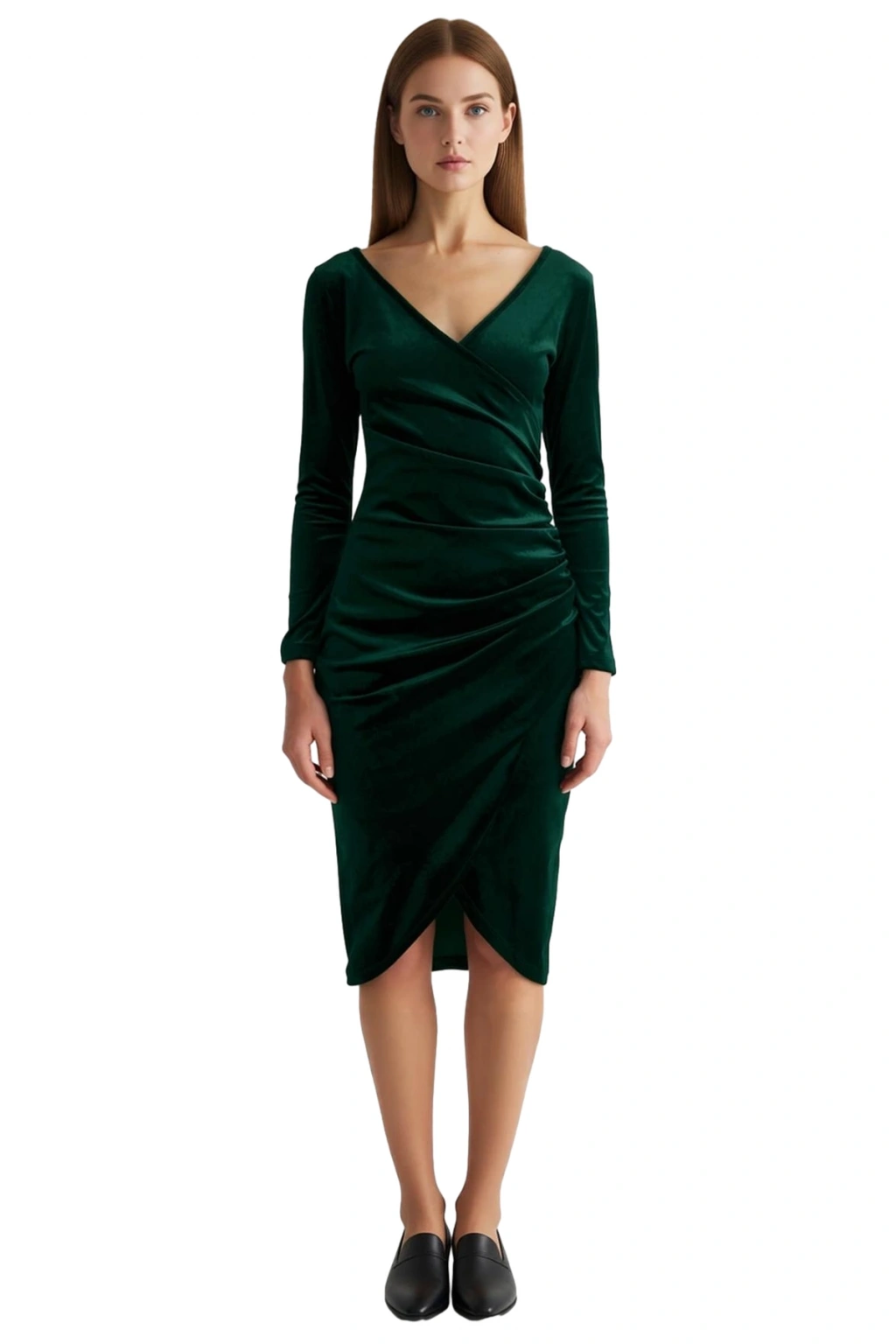 Ürün Özellikleri: Bodycon kalıp, polyester kadife materyal, düz desen, kruvaze yaka, uzun standart kol, örme kumaş, yeşil renk.