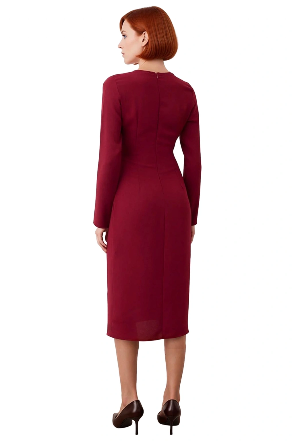Ürün Özellikleri: A-line kalıp, %100 Polyester materyal, düz desen, bisiklet yaka, standart kol, dokuma krep kumaş, bordo renk, aksesuar detaylı tasarım, midi boy.