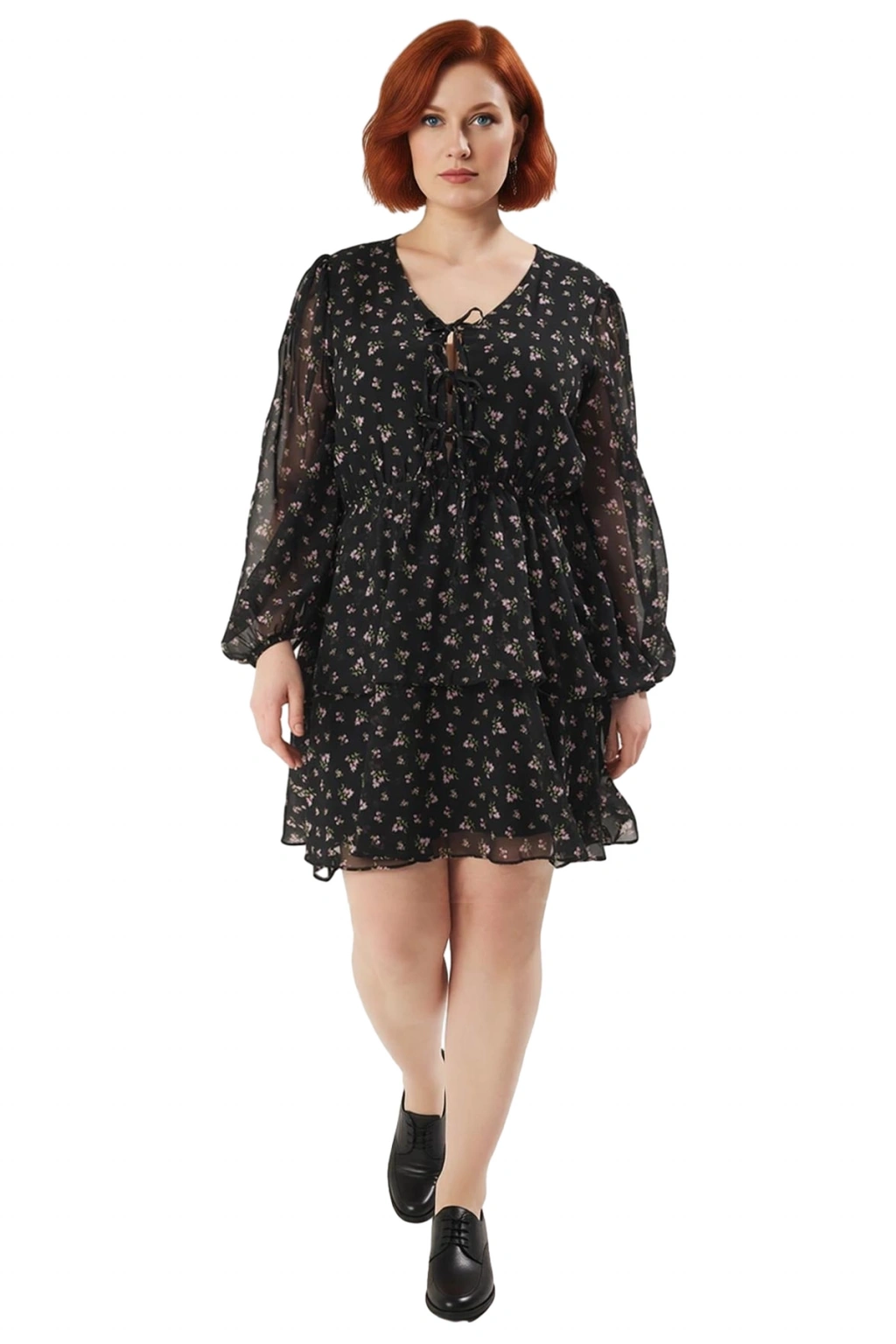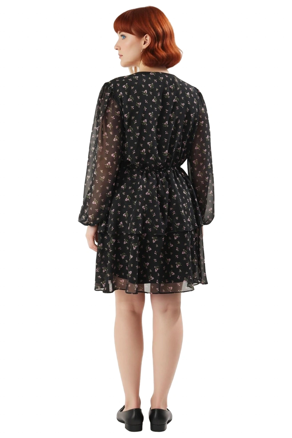 Ürün Özellikleri: Skater kalıp, %100 polyester materyal, çiçekli desen, V yaka, uzun balon kol, şifon dokuma kumaş, siyah renk, astarsız.