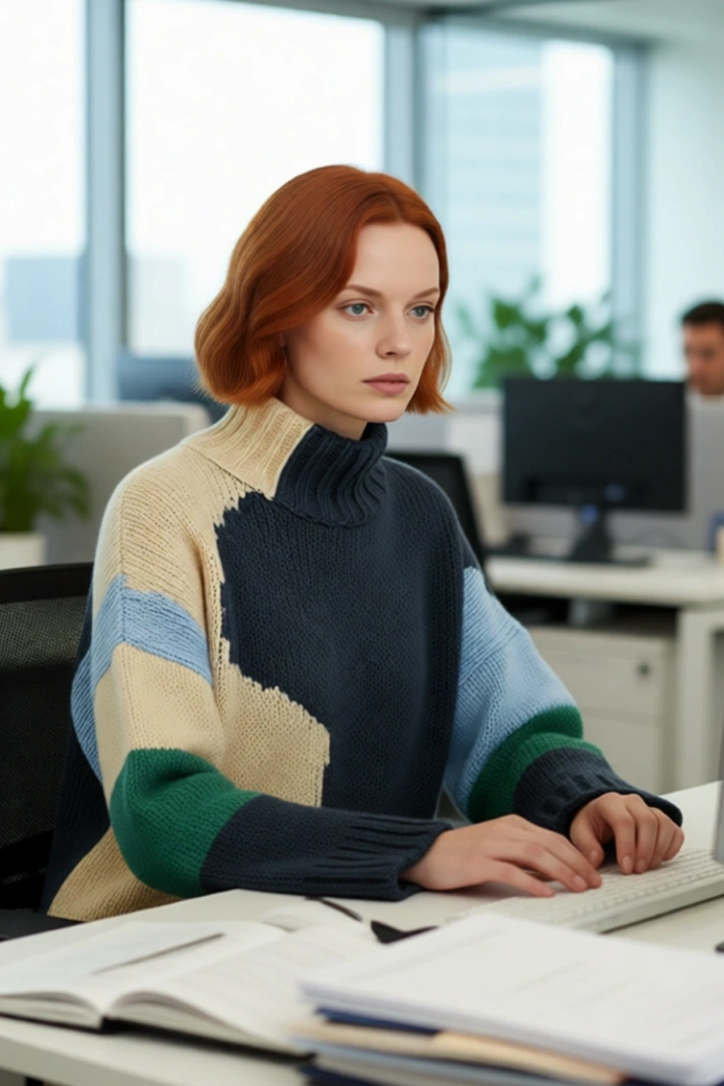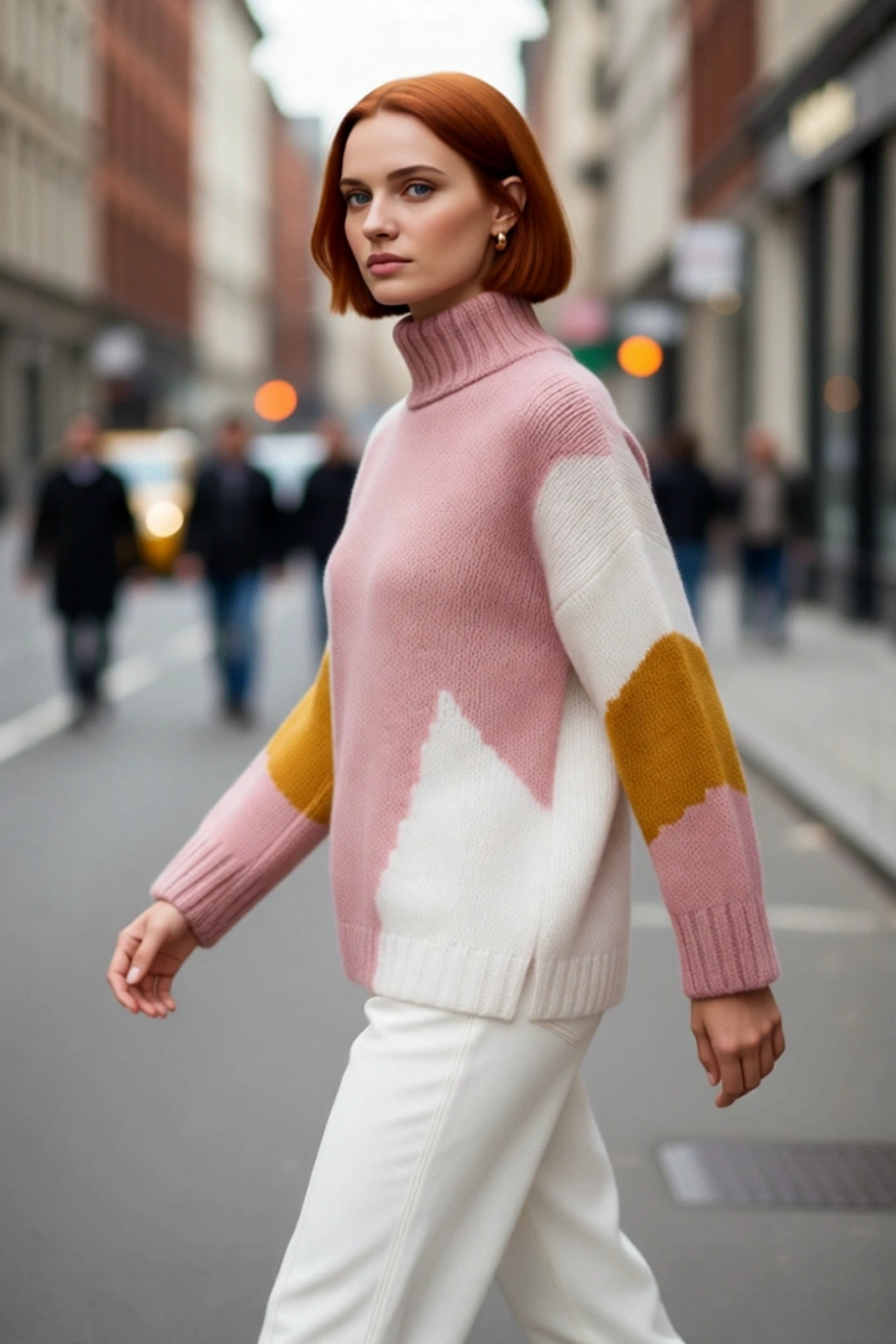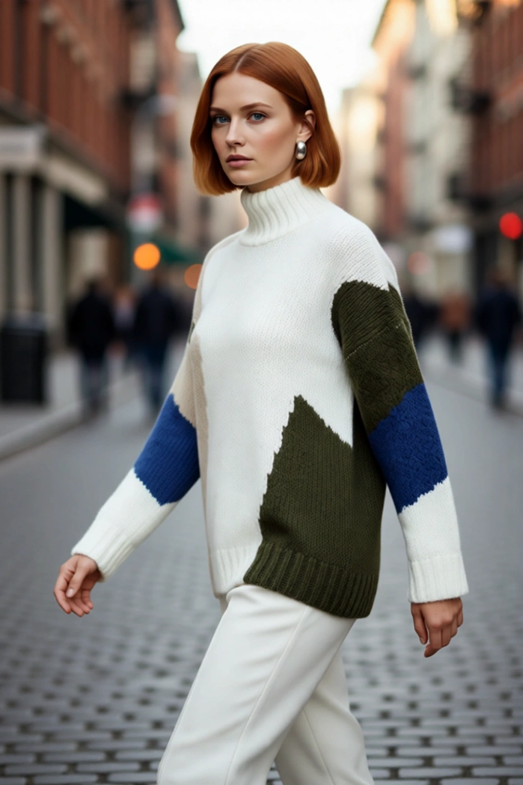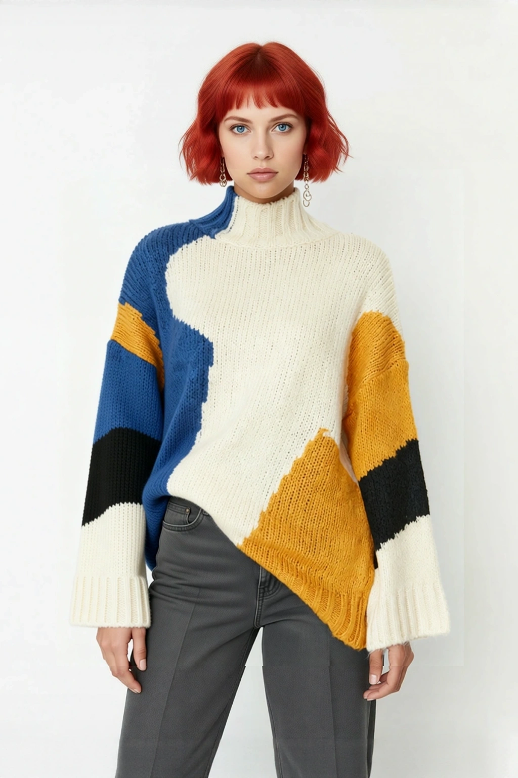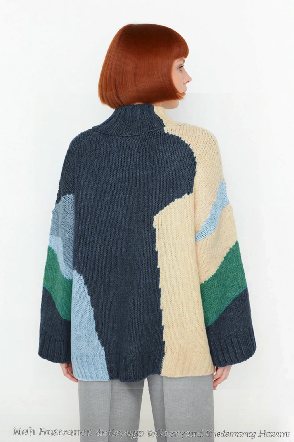 Ürün Özellikleri: Oversize kalıp, 75% Akrilik 22% Polyester 3% Elastan materyal, renk bloklu desen, dik yaka, düşük kol, triko kumaş, çok renkli, basic siluet.
