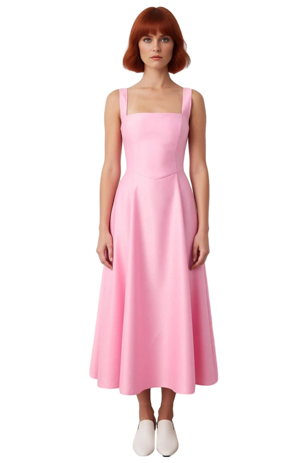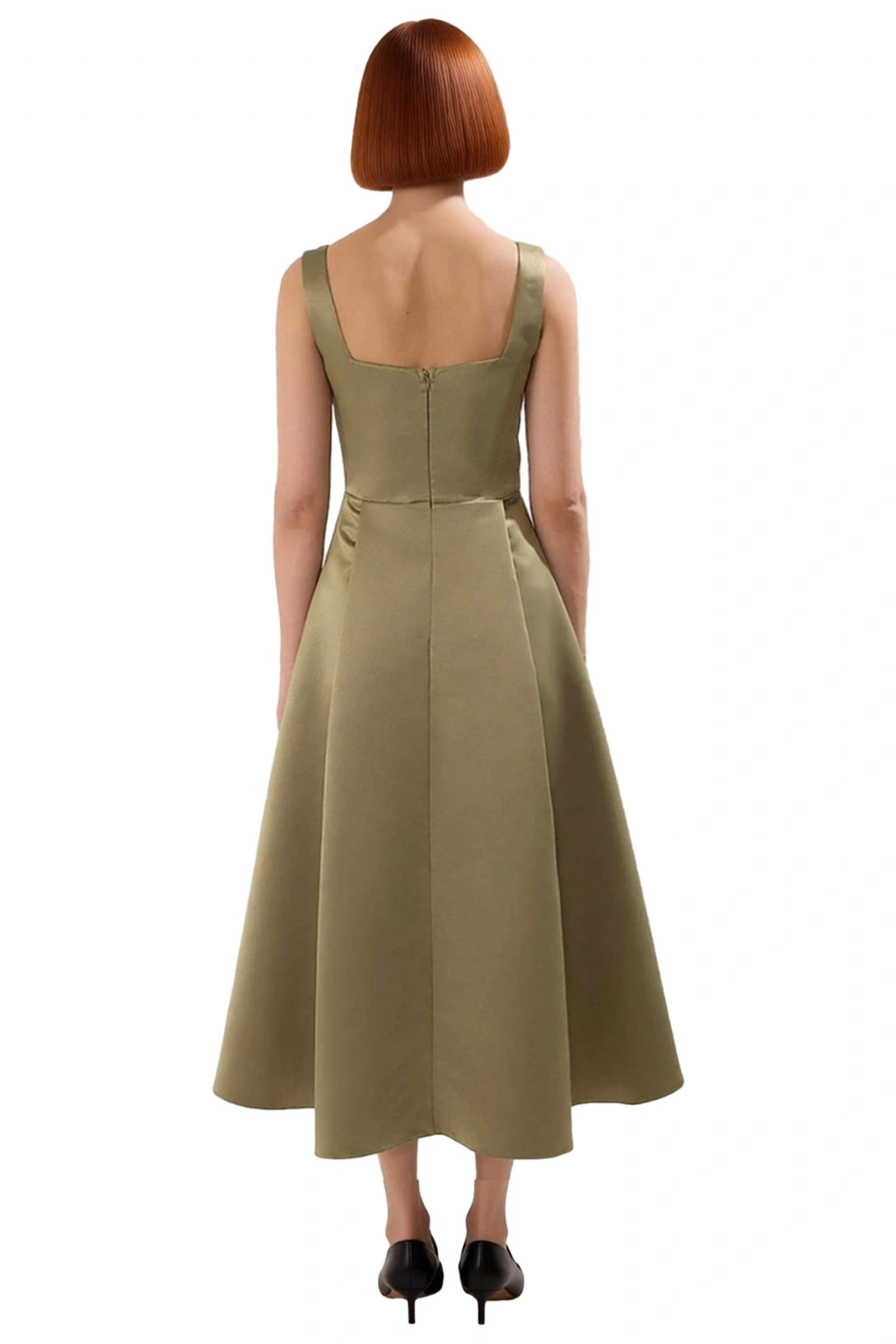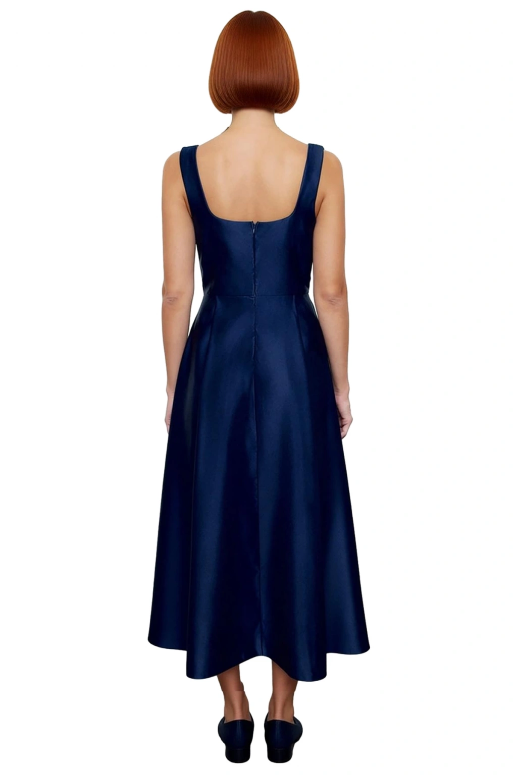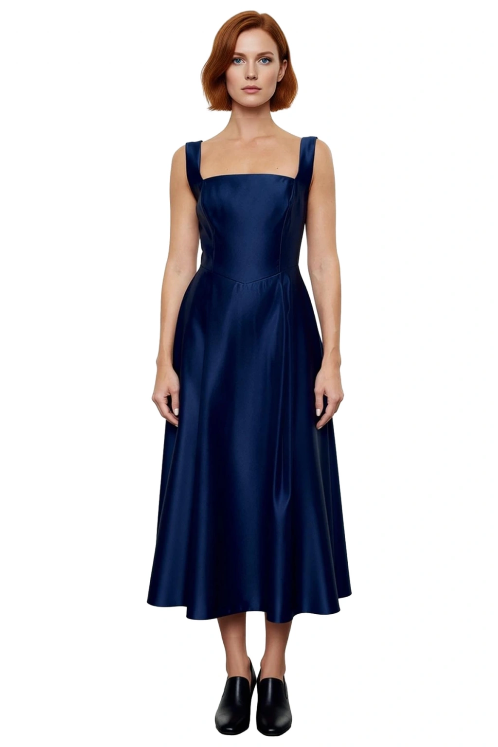 Kare yaka tasarımı, klasik zarafeti modern bir dokunuşla birleştirirken, kalın askılı kol tipi omuzlarınıza asil bir görünüm kazandırır. Kolsuz yapısı, sıcak havalarda ve dans ederken rahat hareket etme imkanı sunar. Saten dokuma kumaşın akışkan yapısı, her hareketinizde nazikçe salınarak şık bir siluet yaratır. Astarsız tasarımı hafiflik ve nefes alabilirlik sağlarken, midi boyu hem zarif hem de çağdaş bir stil sunar. Bu elbise, yüksek kaliteli işçiliği sayesinde uzun yıllar boyunca gardırobunuzdaki favori parçalarınızdan biri olacak, kolay bakımıyla da pratik bir kullanım sunar.