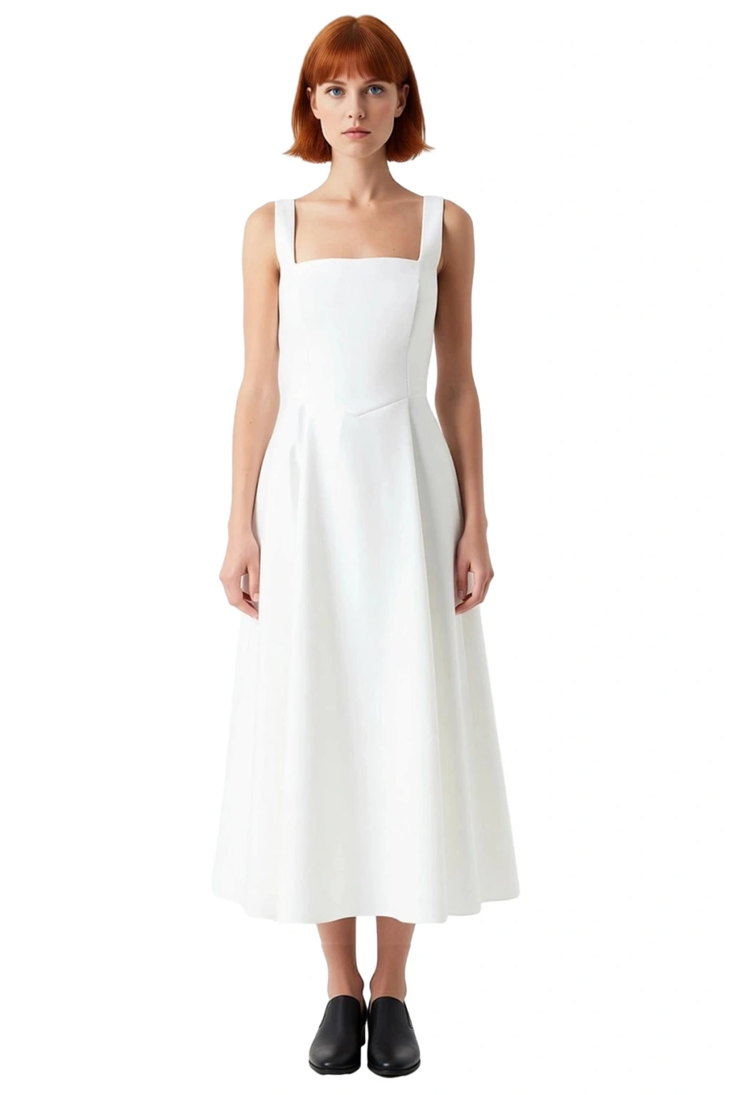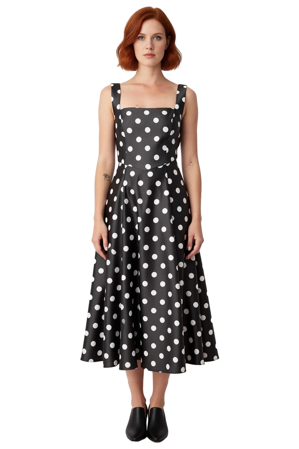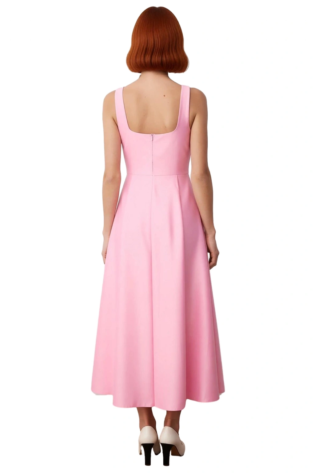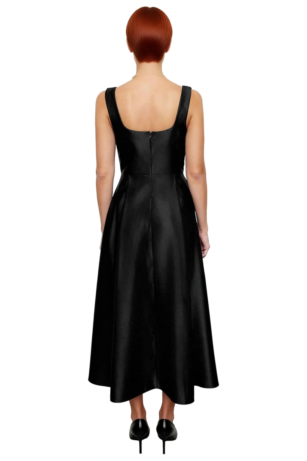 Kare yaka tasarımı, klasik zarafeti modern bir dokunuşla birleştirirken, kalın askılı kol tipi omuzlarınıza asil bir görünüm kazandırır. Kolsuz yapısı, sıcak havalarda ve dans ederken rahat hareket etme imkanı sunar. Saten dokuma kumaşın akışkan yapısı, her hareketinizde nazikçe salınarak şık bir siluet yaratır. Astarsız tasarımı hafiflik ve nefes alabilirlik sağlarken, midi boyu hem zarif hem de çağdaş bir stil sunar. Bu elbise, yüksek kaliteli işçiliği sayesinde uzun yıllar boyunca gardırobunuzdaki favori parçalarınızdan biri olacak, kolay bakımıyla da pratik bir kullanım sunar.