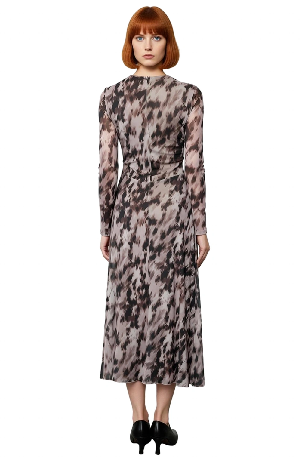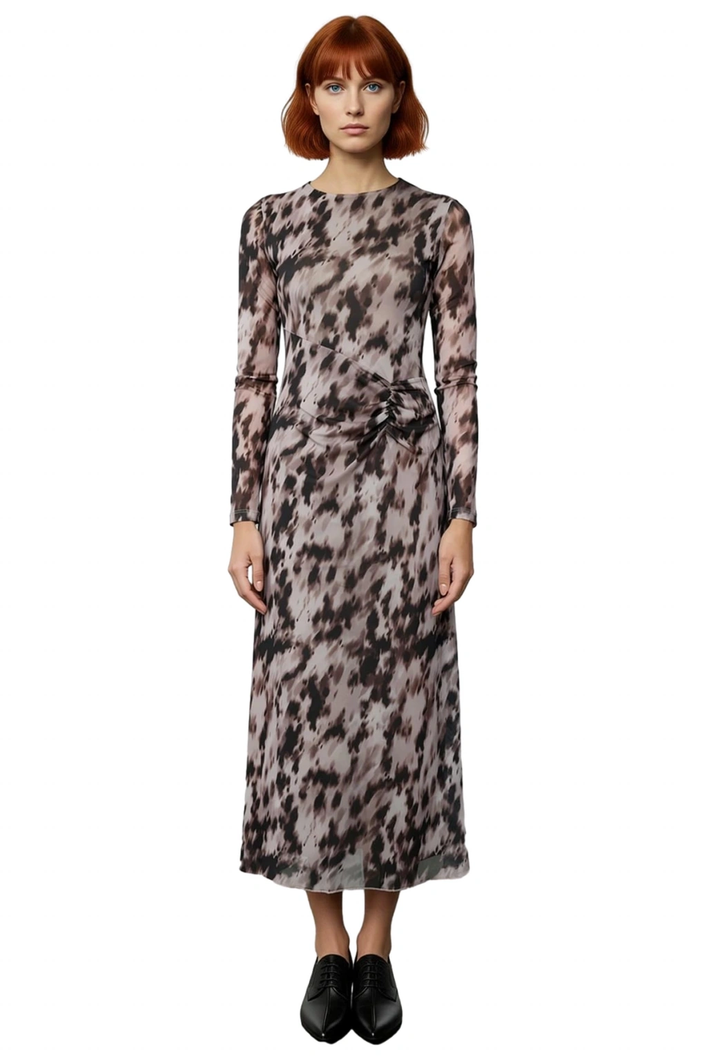 Ürün Özellikleri: A-line kalıp, polyester karışımlı materyal, soyut desen, bisiklet yaka, standart uzun kol, örme kumaş, kahverengi renk.