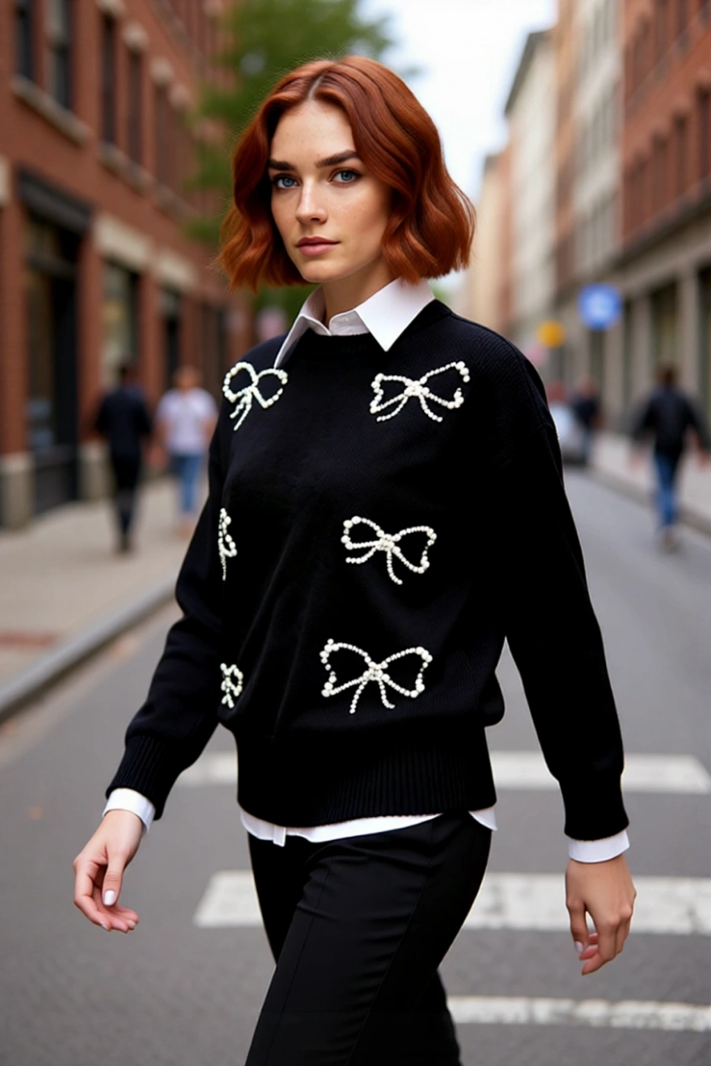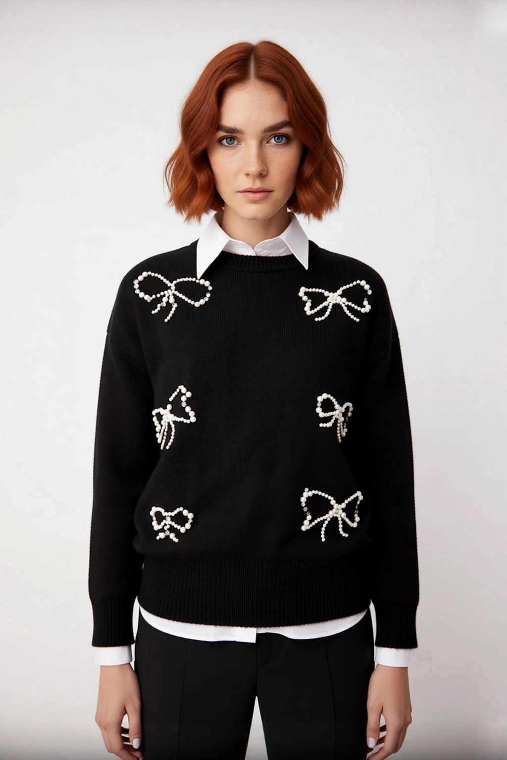 Ürün Özellikleri: Regular kalıp, akrilik polyester materyal, incili fiyonk desen, bisiklet yaka, standart kol, triko kumaş, siyah renk, nakışlı işlemeli tasarım.