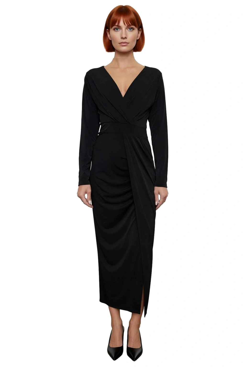 Kruvaze yaka tasarımı, sofistike bir dokunuşla dekolte bölgesini vurgularken, anvelop kapama şekli elbiseye akıcı ve modern bir çizgi kazandırır. Uzun standart kolları, kış ve sonbahar aylarında hem sıcak tutar hem de elegan bir görünüm sergiler. Astarsız yapısı sayesinde hafif ve nefes alabilir bir deneyim sunarken, Sandy dokuma tipi kumaşın kalitesi iç göstermez bir güvence verir. Cepsiz ve baskısız tasarımıyla minimalist bir şıklık sunan bu elbise, özel günlerdeki zarafetinizi tamamlar. Dayanıklı yapısı ve kolay bakımı sayesinde uzun yıllar gardırobunuzun favori parçası olmaya adaydır.