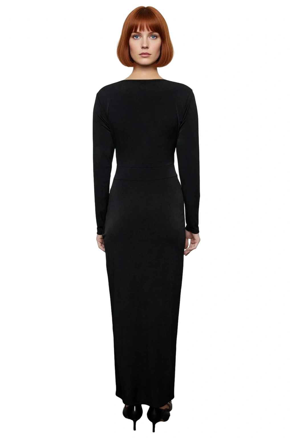 Ürün Özellikleri: Bodycon kalıp, polyester materyal, düz desen, kruvaze yaka, standart kol, örme sandy kumaş, siyah renk, baskısız tasarım.