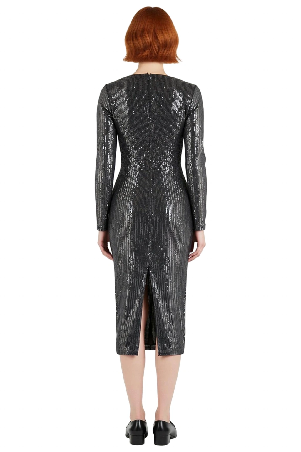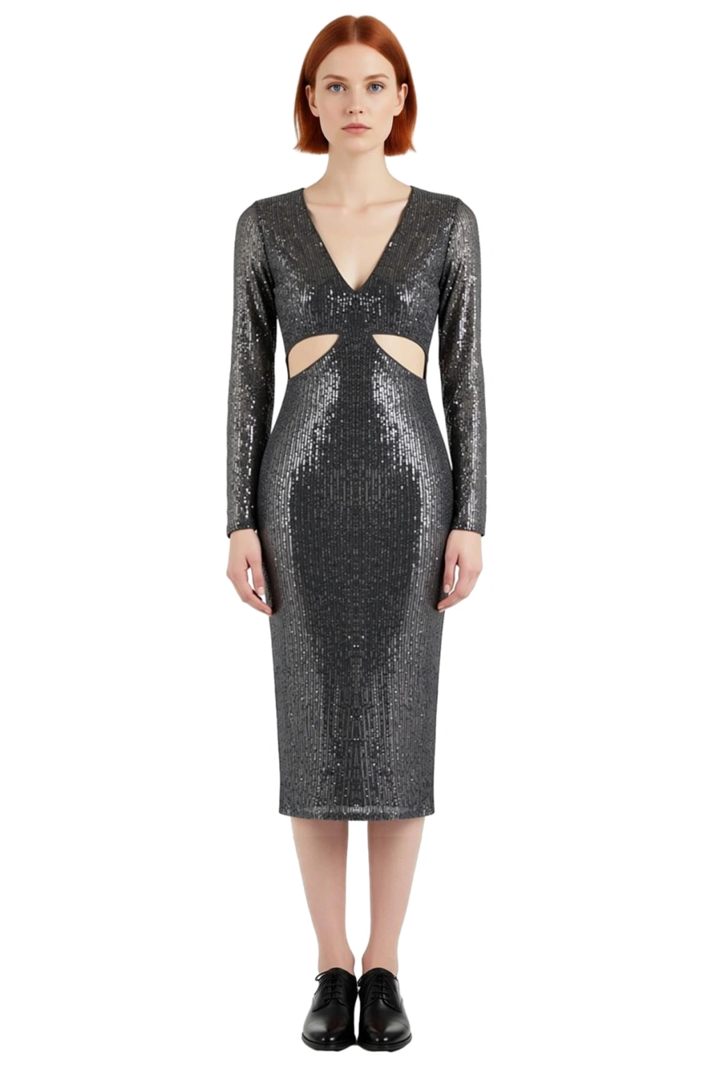 Ürün Özellikleri: Bodycon kalıp, örme materyal, düz desen, V yaka, standart kol, payet dokulu kumaş, gri renk, cut outlı detay, astarlı, midi boy.
