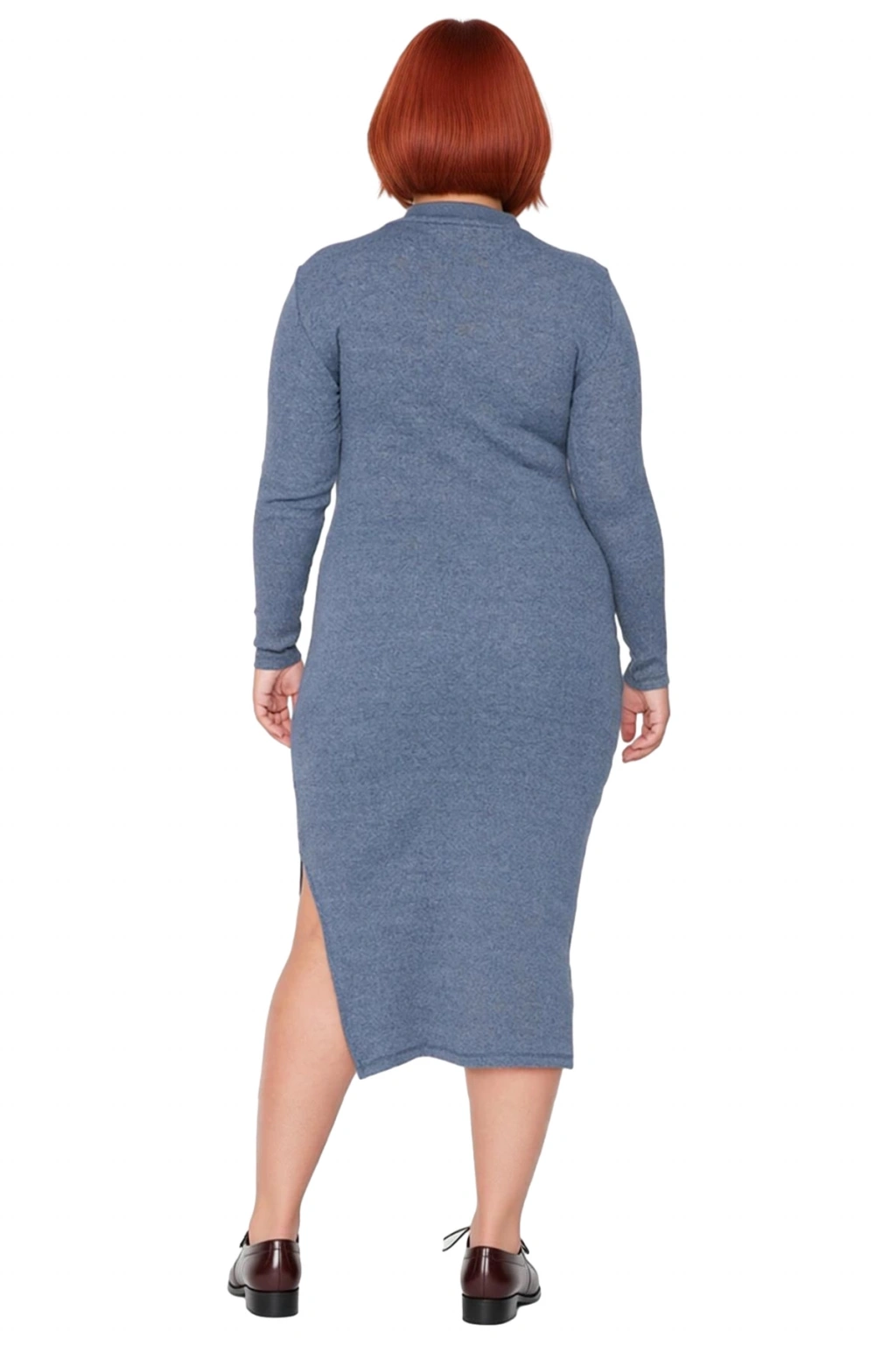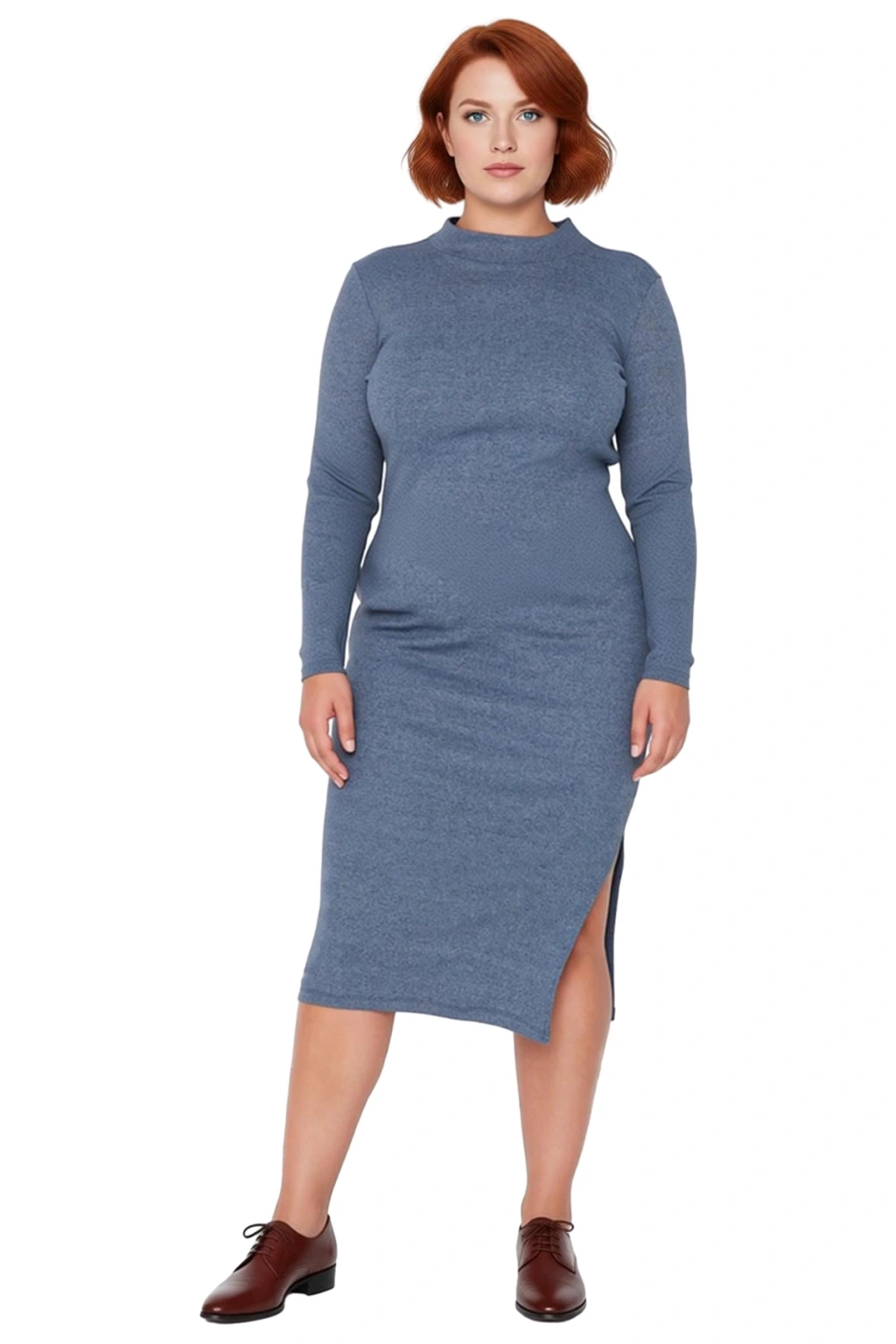 Ürün Özellikleri: Bodycon kalıp, pamuk polyester karışımı materyal, düz desen, dik yaka, uzun kol, kaşkorse örme kumaş, mavi renk, yırtmaçlı tasarım.