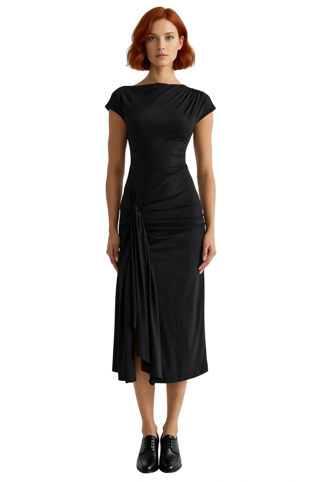Kayık yaka tasarımı, tek omuz detayıyla elbiseye özgün bir karakter kazandırır. Tek omuzda yer alan kısa kol, zarif bir dokunuş eklerken, örme ve sandy dokuma kumaş tipi elbiseye hafiflik ve rahatlık katar. Midi boyu ve yan kısımdaki göz alıcı drapeleri, A kesim siluetini destekleyerek feminen hatları ön plana çıkarır. Astarsız yapısı sayesinde nefes alabilir bir konfor sunarken, polyesterin dayanıklılığı ile uzun süreli kullanıma uygundur. Kolay bakım özelliği ile pratik bir kullanım sunar.