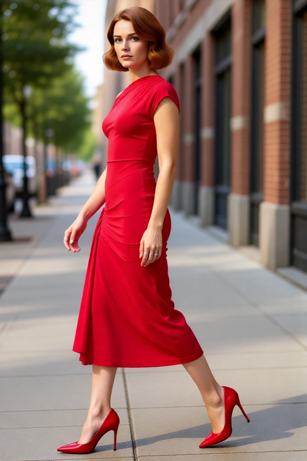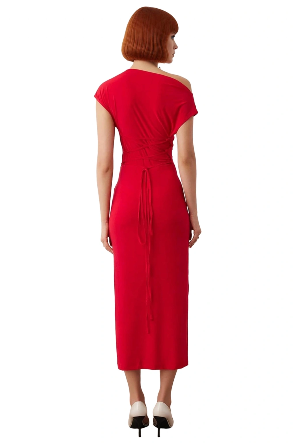 Ürün Özellikleri: A-line kalıp, polyester elastan materyal, düz desen, kayık yaka, tek omuz kısa kol, örme sandy kumaş, kırmızı renk, astarsız tasarım, midi boy.