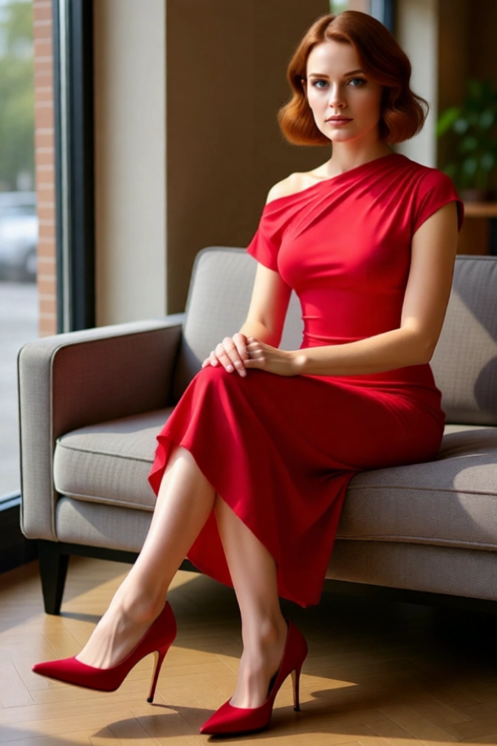 Ürün Özellikleri: A-line kalıp, polyester elastan materyal, düz desen, kayık yaka, tek omuz kısa kol, örme sandy kumaş, kırmızı renk, astarsız tasarım, midi boy.