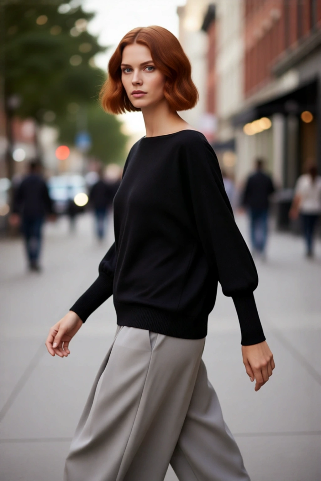Bu zarif kadın oversize triko kazak, kayık yaka detayıyla modern ve sofistike bir görünüm sunar. %100 akrilik materyali sayesinde kış ve sonbahar günlerinde üstün sıcaklık ve konfor sağlarken, yumuşak dokusuyla cildinize narin bir temas hissi verir. Düz deseni ve klasik siyah rengi, kolayca kombinlenebilir yapısıyla her tarza uyum sağlar. Geniş kalıbı, hareket özgürlüğü ve rahatlığı bir arada arayan kadınlar için mükemmel bir seçenektir. Gündüz ve gece her an şıklığınızı tamamlar.