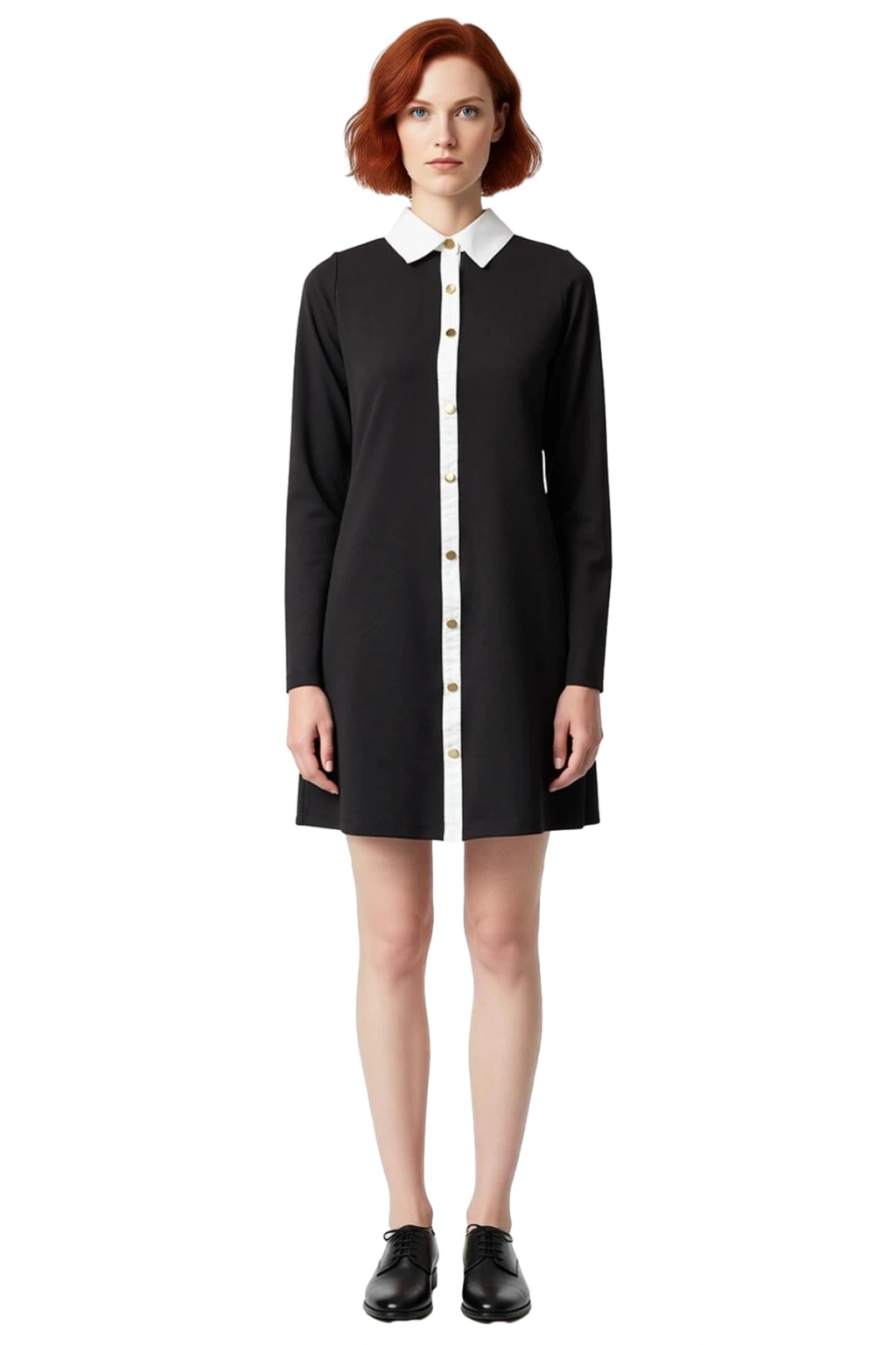 Bu Kadın Polo Yaka Uzun Kollu Mini Shift Elbise, çağdaş ve sofistike bir stil arayanlar için tasarlandı. Rahat shift kalıbı, vücut hatlarını nazikçe takip ederek hem şık hem de konforlu bir giyim deneyimi sunar. %95 Polyester ve %5 Elastan içeren polyester karışımlı materyali, esneklik ve formunu koruma özelliğiyle dikkat çeker. Siyah rengin hakim olduğu tasarım, ön kısımda beyaz renk bloklu şerit ve altın rengi düğme detaylarıyla modern bir kontrast yaratır, bu da elbiseye benzersiz bir çekicilik katar.