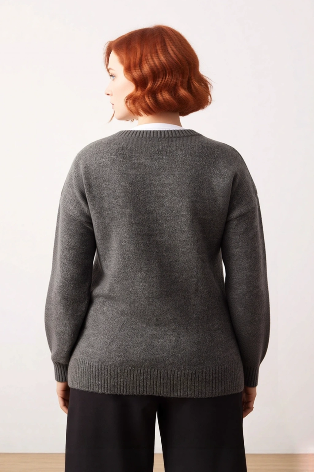 Kış gardırobunuzun yıldız parçası olmaya aday bu kadın triko kazak, regular kalıbıyla hem şık hem de konforlu bir giyim deneyimi sunar. %80 akrilik ve %20 polyesterden oluşan materyal bileşeni sayesinde, soğuk havalarda maksimum sıcaklık sağlarken, aynı zamanda son derece yumuşak ve cilt dostu bir yapıya sahiptir. Gri rengin asil tonu, polo yaka üzerindeki göz alıcı taş detaylarıyla birleşerek sade ama etkileyici bir estetik yaratır. Düz deseni sayesinde kombinlemesi oldukça kolaydır.