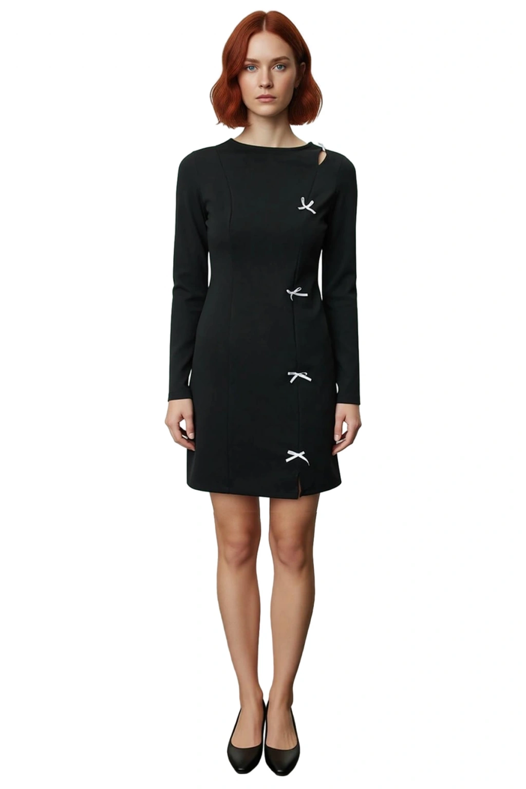 Ürün Özellikleri: Bodycone kalıp, viskon karışımlı materyal, düz desen, bisiklet yaka, standart kol, örme kumaş, siyah renk, fiyonklu ürün detayı.