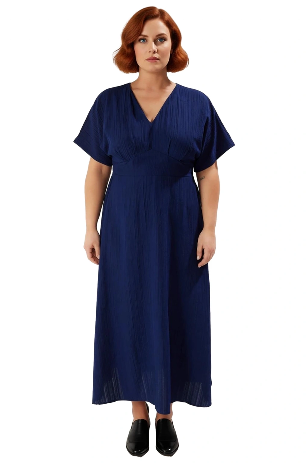 V yaka kesimi, feminen bir dokunuş katarken boyun bölgesini uzun gösterir. Kısa standart kol detayı, özellikle ilkbahar ve sonbahar gibi geçiş mevsimlerinde ideal bir kullanım sunar. Dokuma kumaşın hafifliği ve hava alabilen yapısı, sıcaklığın değişim gösterdiği günlerde bile ferah kalmanızı sağlar. Crinkle dokusu sayesinde ütü derdi olmadan anında giyilebilir. Dayanıklı materyali ve kolay yıkama talimatı (T10), bu elbiseyi uzun yıllar boyunca gardırobunuzun favori parçası yapar. Bu elbise, her an şık ve rahat olmak isteyen kadınlar için tasarlandı.