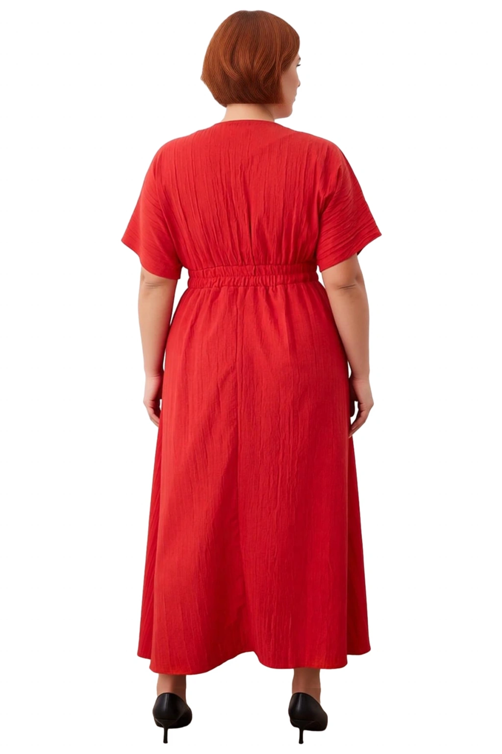 Ürün Özellikleri: A-line kalıp, %99 polyester %1 elastan materyal, baskısız desen, V yaka, kısa standart kol, dokuma crinkle kumaş, kırmızı renk.