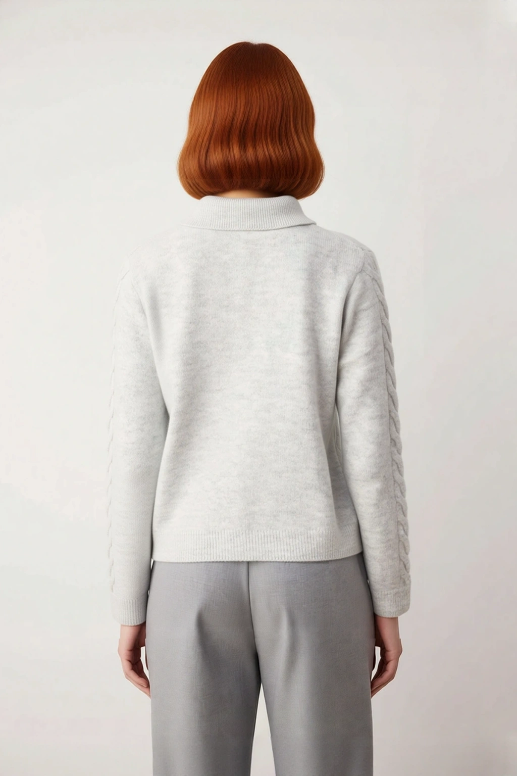 Ürün Özellikleri: Regular kalıp, akrilik polyester elastan materyal, saç örgü desen, polo yaka, standart kol, triko kumaş, gri renk, basic siluet.