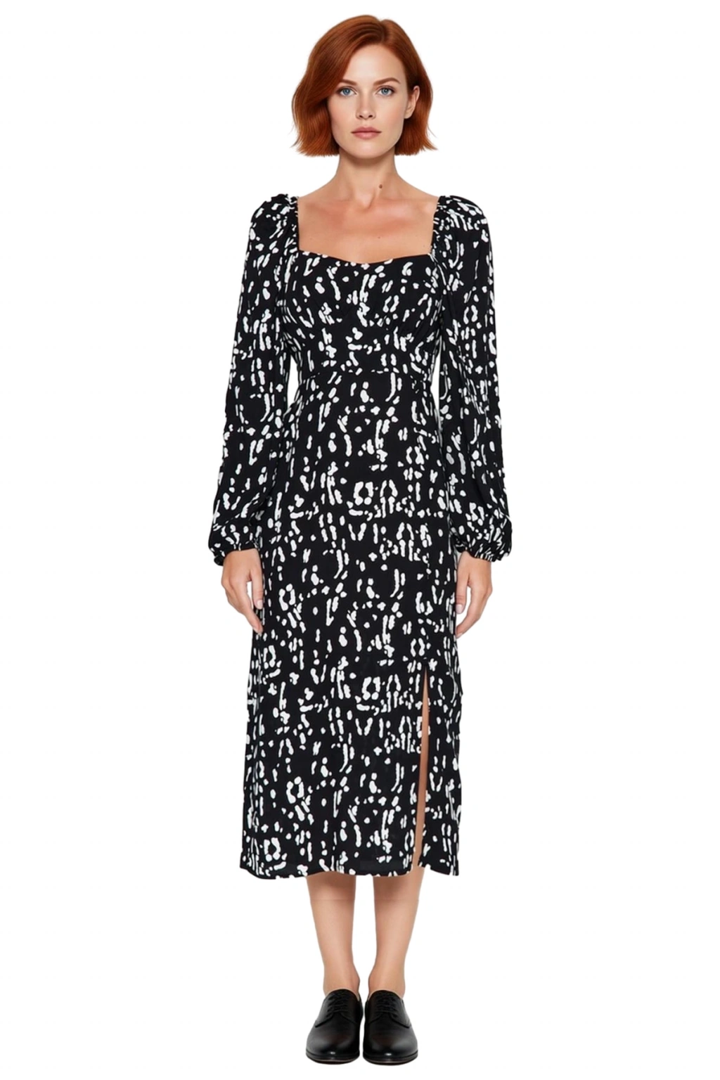 Kadın Şık Yırtmaç Detaylı A Kesim Elbise, zarif kalp yaka ve modern balon kollarıyla ilkbahar ve sonbahar gardırobunuzun vazgeçilmezi olacak. %100 viskoz materyalden üretilen bu elbise, hafif ve akışkan shally dokuma kumaşı sayesinde gün boyu üstün konfor sunar. Siyah zemin üzerindeki soyut desenler, klasik ve modern birleşimiyle tarzınıza dinamik bir hava katar. Bu astarsız tasarım, doğal bir döküm sağlayarak feminen silueti en güzel şekilde ortaya çıkarır ve her ortamda dikkatleri üzerinize çeker.