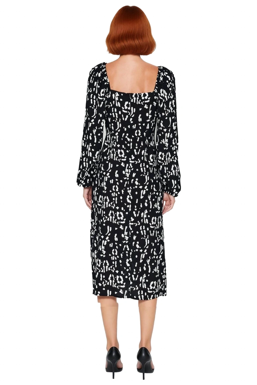Ürün Özellikleri: A-line kalıp, %100 viskoz materyal, soyut desen, kalp yaka, uzun balon kol, shally dokuma kumaş, siyah renk.