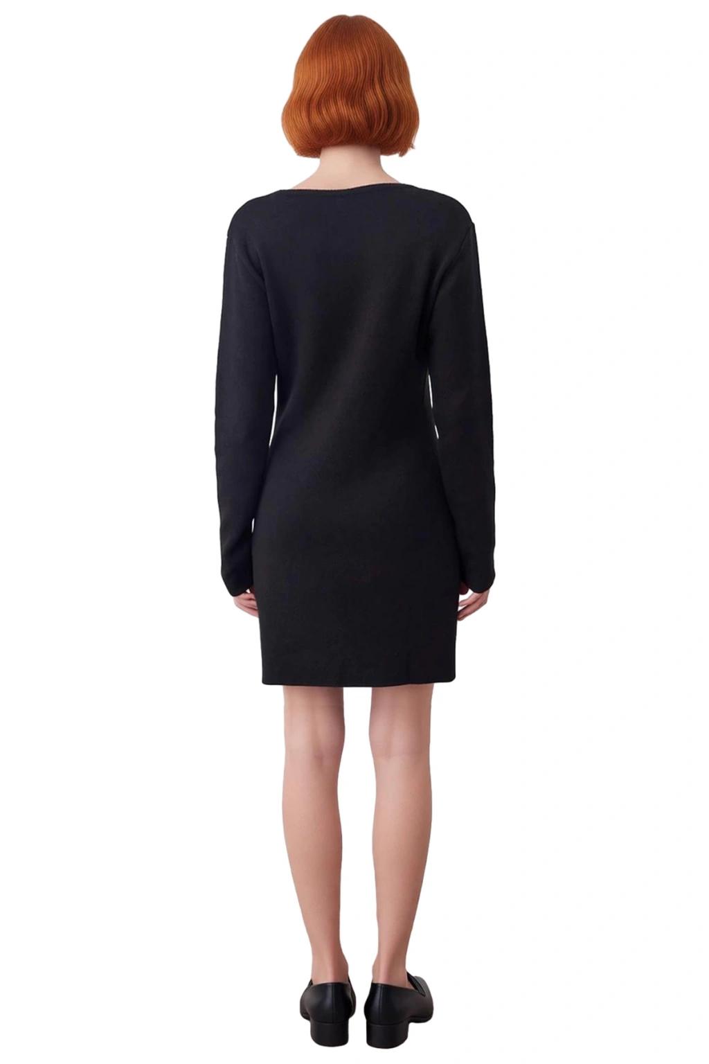 Ürün Özellikleri: A-line kalıp, %50 akrilik %50 pamuk materyal, düz desen, kaçık yaka, standart kol, triko kumaş, siyah renk.